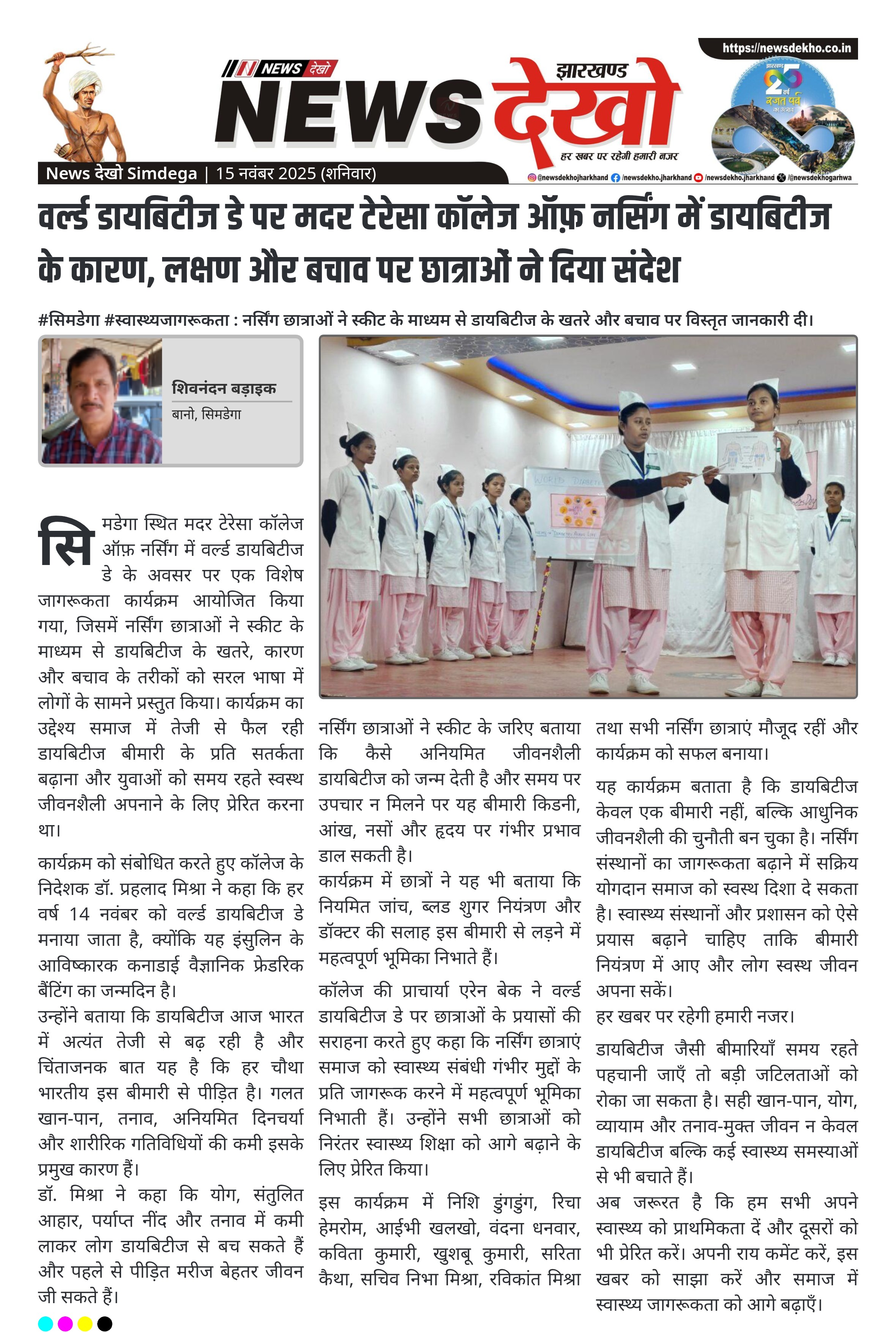 सिमडेगा स्थित मदर टेरेसा कॉलेज ऑफ़ नर्सिंग में वर्ल्ड डायबिटीज डे के अवसर पर एक विशेष जागरूकता कार्यक्रम आयोजित किया गया, जिसमें नर्सिंग छात्राओं ने स्कीट के माध्यम से डायबिटीज के खतरे, कारण और बचाव के तरीकों को सरल भाषा में लोगों के सामने प्रस्तुत किया। कार्यक्रम का उद्देश्य समाज में तेजी से फैल रही डायबिटीज बीमारी के प्रति सतर्कता बढ़ाना और युवाओं को समय रहते स्वस्थ जीवनशैली अपनाने के लिए प्रेरित करना था।