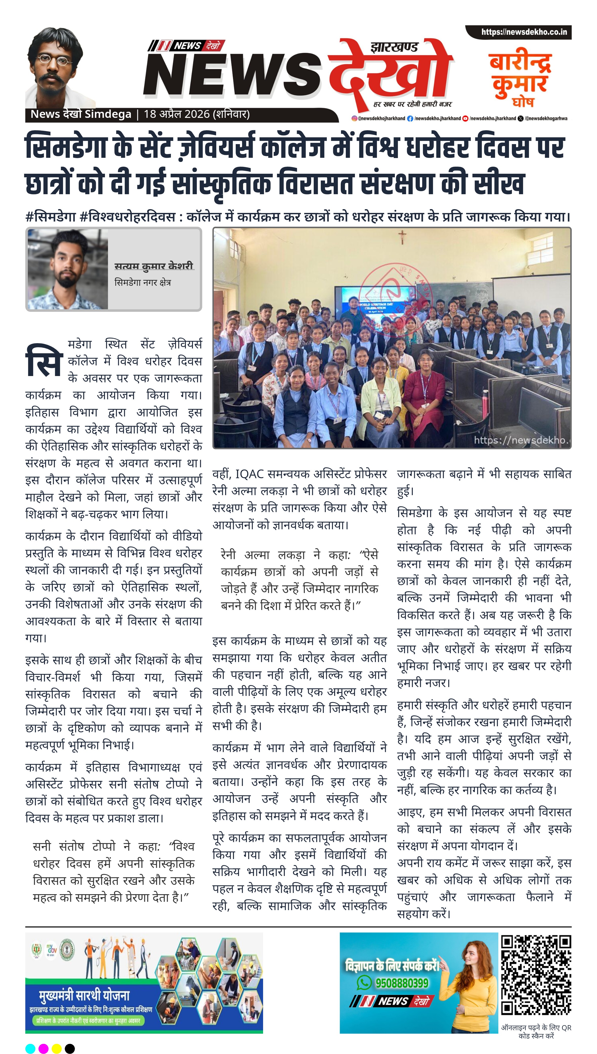 सिमडेगा स्थित सेंट ज़ेवियर्स कॉलेज में विश्व धरोहर दिवस के अवसर पर एक जागरूकता कार्यक्रम का आयोजन किया गया। इतिहास विभाग द्वारा आयोजित इस कार्यक्रम का उद्देश्य विद्यार्थियों को विश्व की ऐतिहासिक और सांस्कृतिक धरोहरों के संरक्षण के महत्व से अवगत कराना था। इस दौरान कॉलेज परिसर में उत्साहपूर्ण माहौल देखने को मिला, जहां छात्रों और शिक्षकों ने बढ़-चढ़कर भाग लिया।