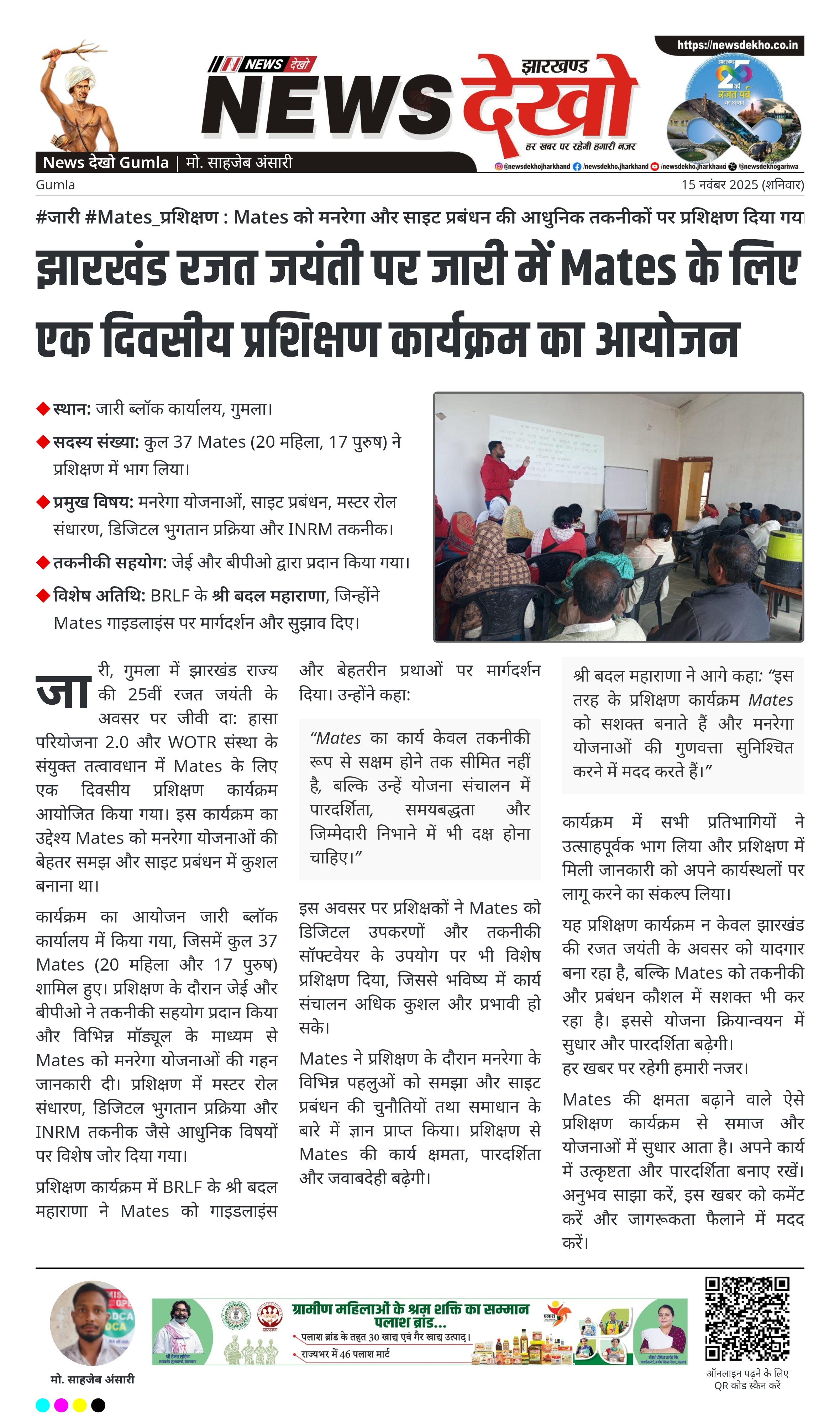यह प्रशिक्षण कार्यक्रम न केवल झारखंड की रजत जयंती के अवसर को यादगार बना रहा है, बल्कि Mates को तकनीकी और प्रबंधन कौशल में सशक्त भी कर रहा है। इससे योजना क्रियान्वयन में सुधार और पारदर्शिता बढ़ेगी।