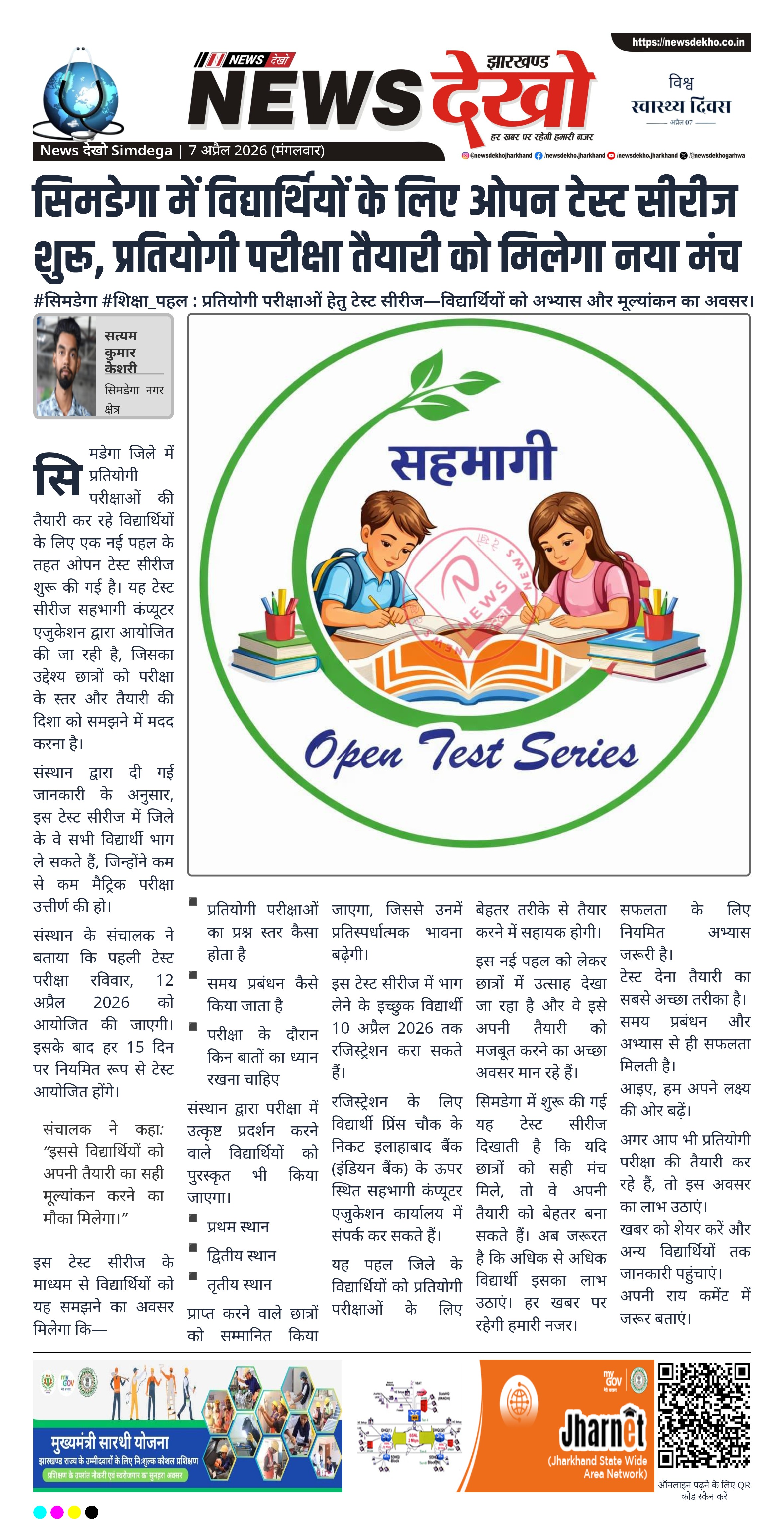 सिमडेगा जिले में प्रतियोगी परीक्षाओं की तैयारी कर रहे विद्यार्थियों के लिए एक नई पहल के तहत ओपन टेस्ट सीरीज शुरू की गई है। यह टेस्ट सीरीज सहभागी कंप्यूटर एजुकेशन द्वारा आयोजित की जा रही है, जिसका उद्देश्य छात्रों को परीक्षा के स्तर और तैयारी की दिशा को समझने में मदद करना है।
