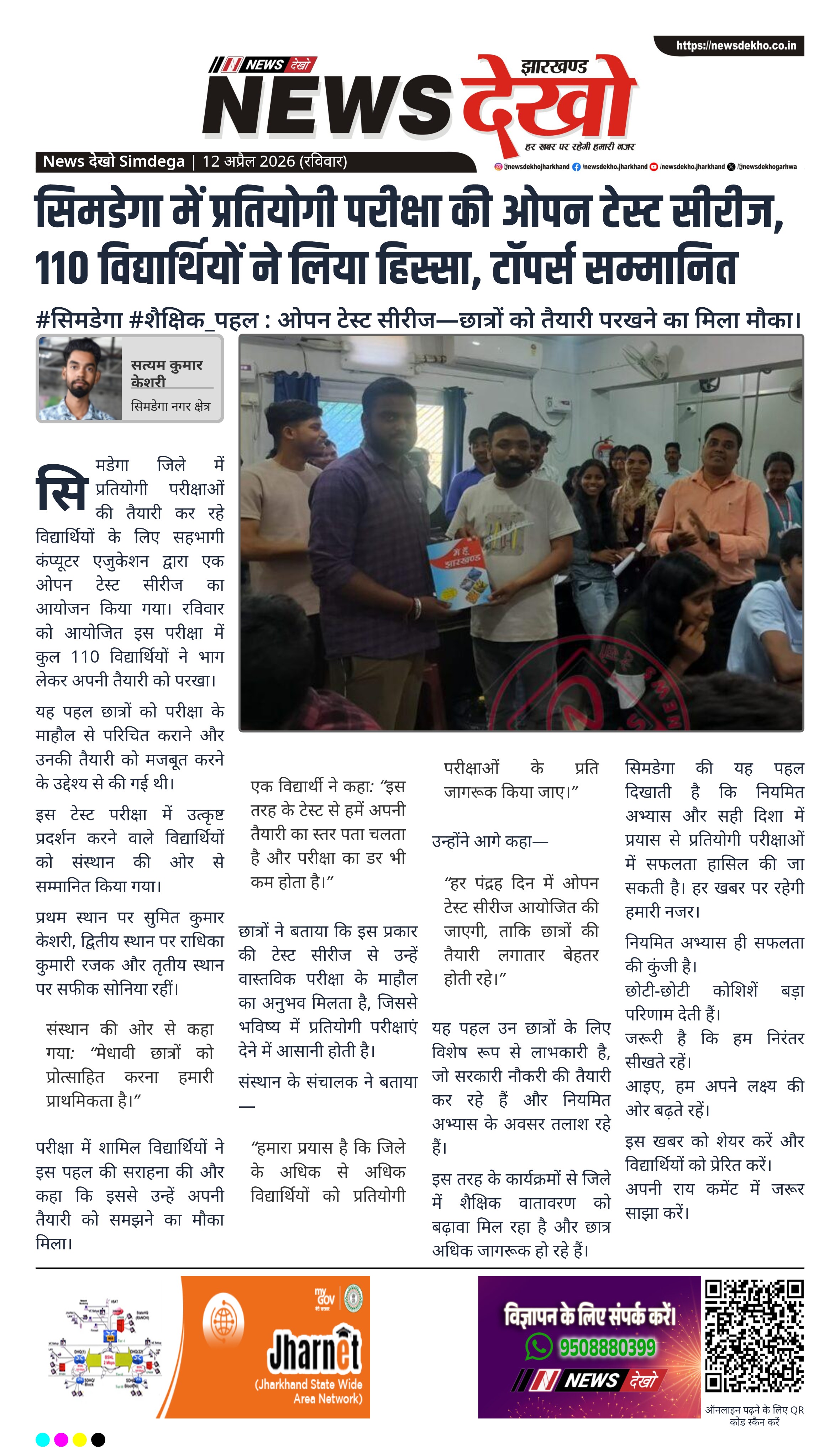 सिमडेगा में प्रतियोगी परीक्षा की तैयारी कर रहे विद्यार्थियों के लिए ओपन टेस्ट सीरीज आयोजित की गई। इसमें 110 छात्रों ने भाग लिया। सुमित कुमार केशरी, राधिका कुमारी रजक और सफीक सोनिया ने क्रमशः प्रथम, द्वितीय और तृतीय स्थान प्राप्त किया। आयोजकों ने इसे छात्रों के लिए उपयोगी पहल बताया।