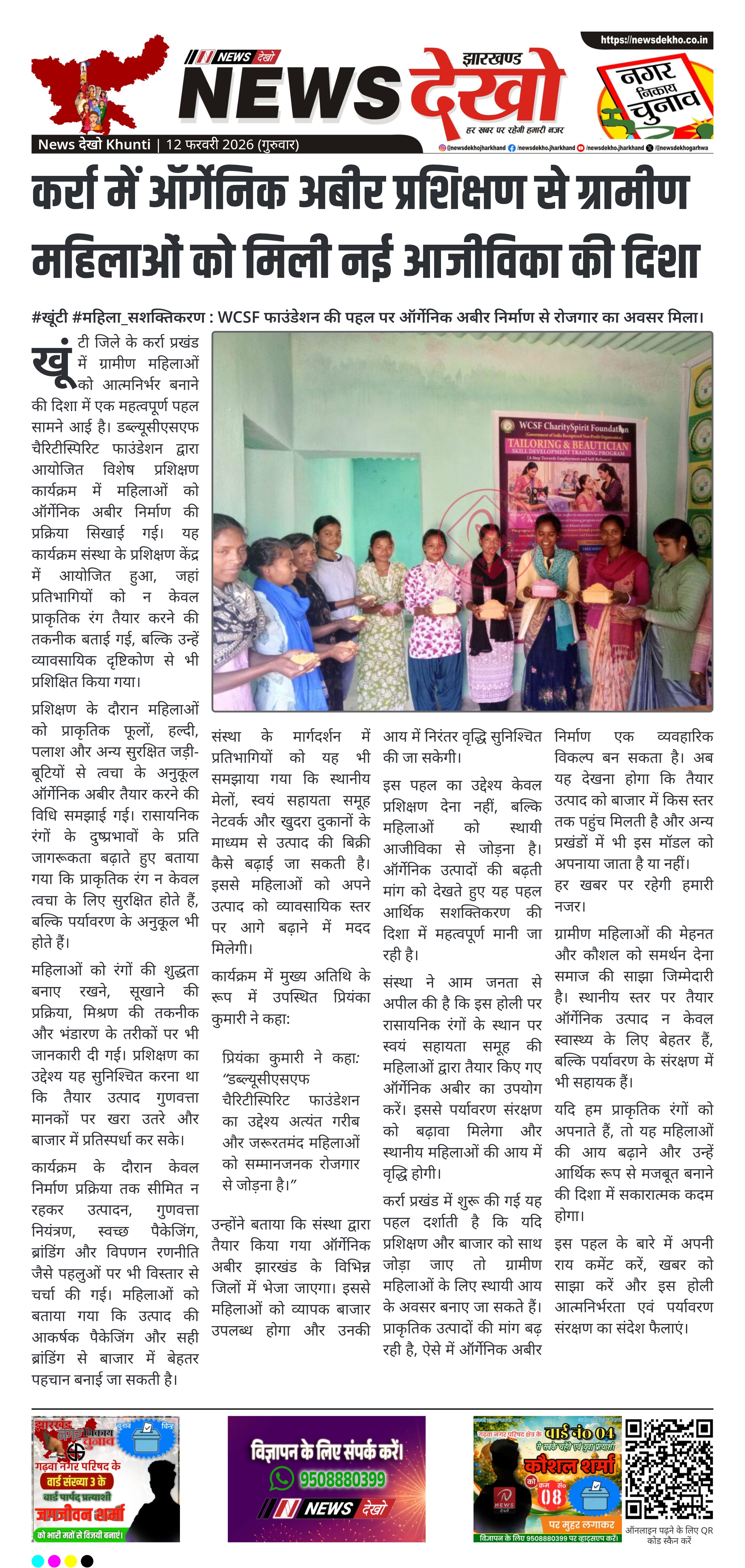 खूंटी जिले के कर्रा प्रखंड में डब्ल्यूसीएसएफ चैरिटीस्पिरिट फाउंडेशन ने ग्रामीण महिलाओं के लिए ऑर्गेनिक अबीर निर्माण का प्रशिक्षण कार्यक्रम आयोजित किया। इस पहल में 20 महिलाओं को प्राकृतिक रंग तैयार करने से लेकर पैकेजिंग और विपणन तक की जानकारी दी गई। कार्यक्रम का उद्देश्य महिलाओं को स्थायी आजीविका से जोड़कर आर्थिक रूप से सशक्त बनाना है। संस्था द्वारा तैयार उत्पाद को झारखंड के विभिन्न जिलों में भेजने की योजना है।
