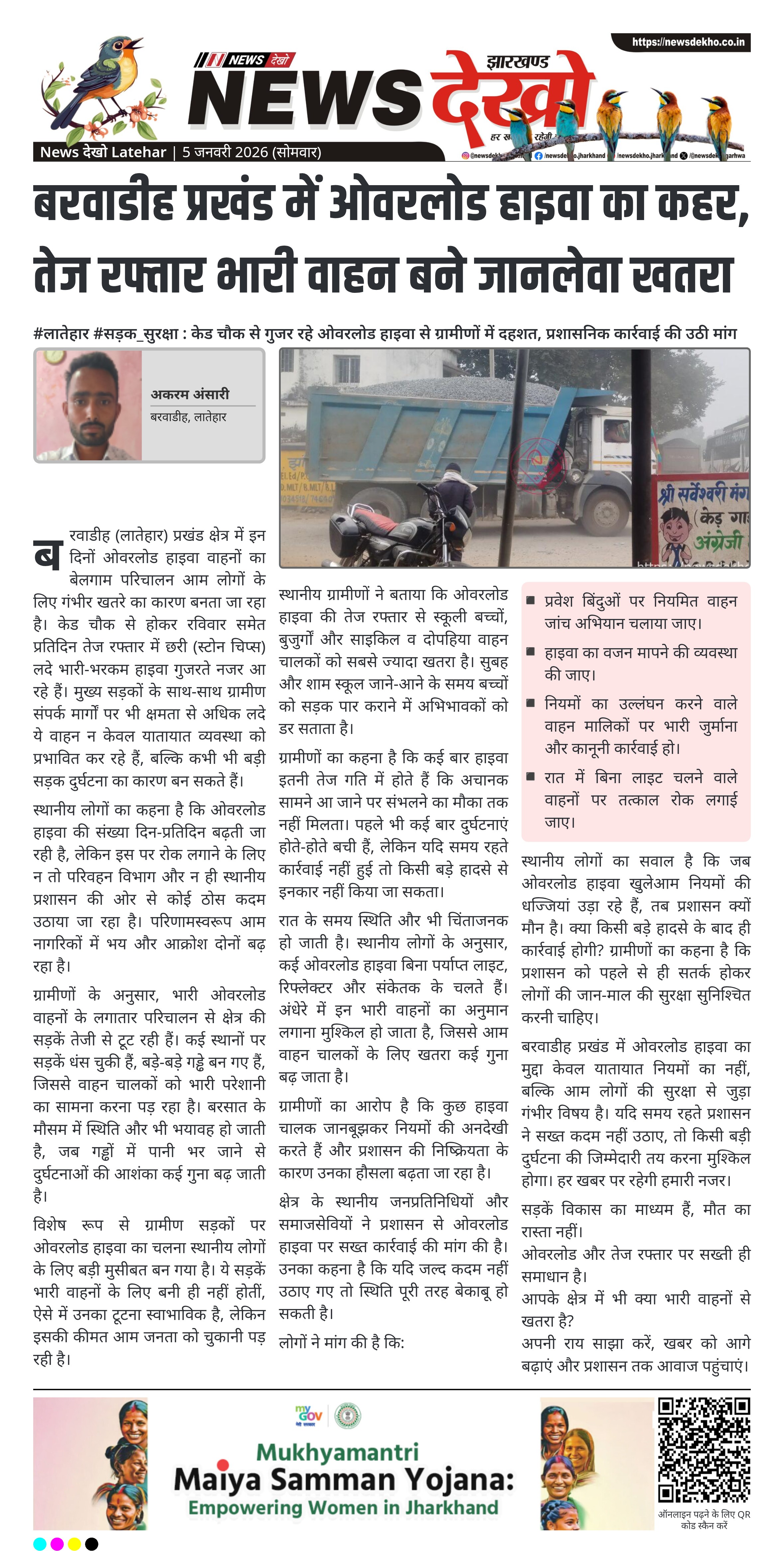बरवाडीह प्रखंड में ओवरलोड हाइवा का मुद्दा केवल यातायात नियमों का नहीं, बल्कि आम लोगों की सुरक्षा से जुड़ा गंभीर विषय है। यदि समय रहते प्रशासन ने सख्त कदम नहीं उठाए, तो किसी बड़ी दुर्घटना की जिम्मेदारी तय करना मुश्किल होगा। हर खबर पर रहेगी हमारी नजर।