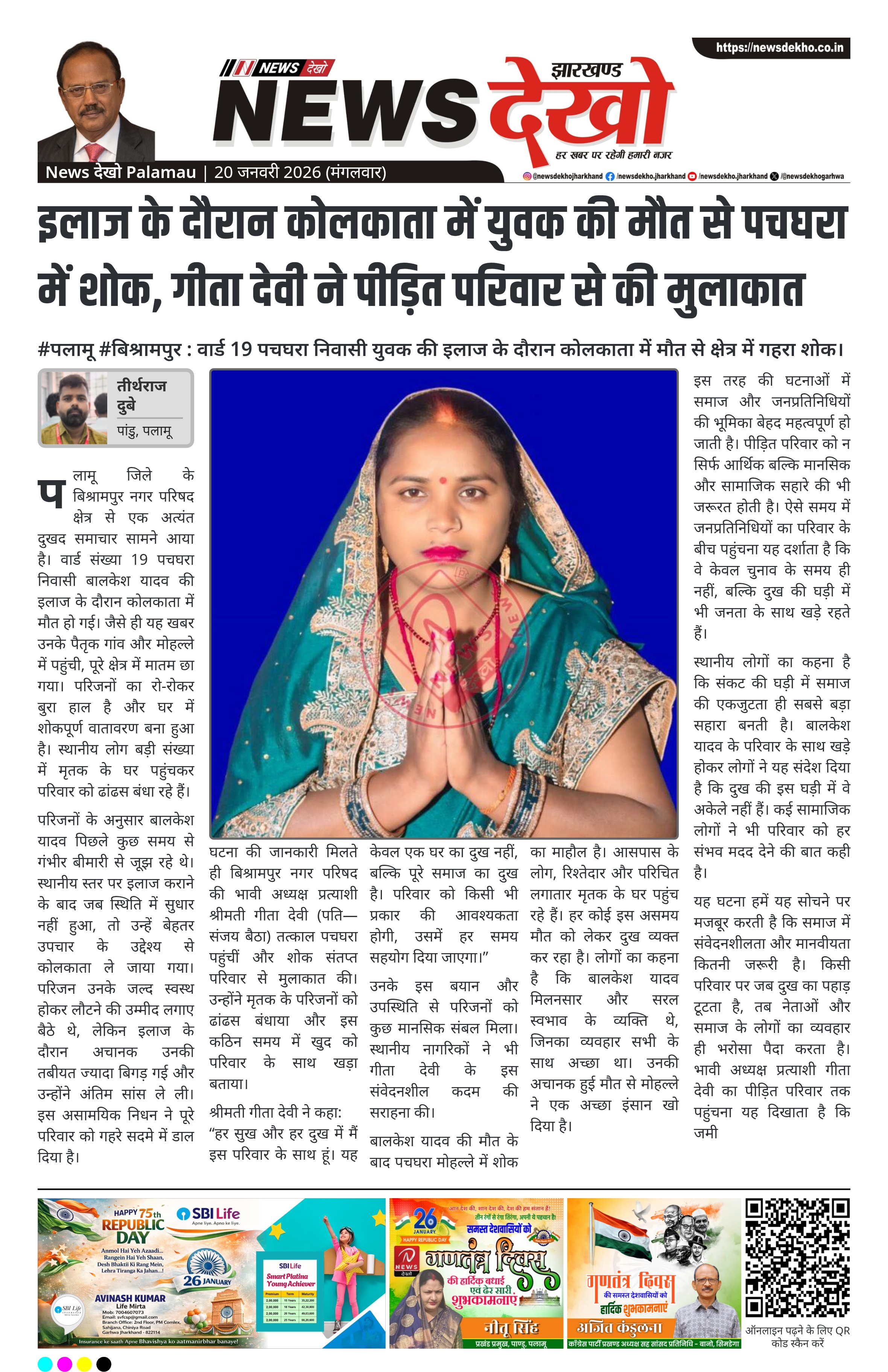 पलामू जिले के बिश्रामपुर नगर परिषद क्षेत्र अंतर्गत वार्ड संख्या 19 पचघरा निवासी बालकेश यादव की इलाज के दौरान कोलकाता में मौत हो गई। इस दुखद घटना से पूरे वार्ड और आसपास के इलाके में शोक का माहौल है। सूचना मिलते ही नगर परिषद बिश्रामपुर की भावी अध्यक्ष प्रत्याशी श्रीमती गीता देवी शोक संतप्त परिवार से मिलने पहुंचीं। उन्होंने परिजनों को ढांढस बंधाते हुए हर सुख-दुख में साथ रहने का भरोसा दिलाया।