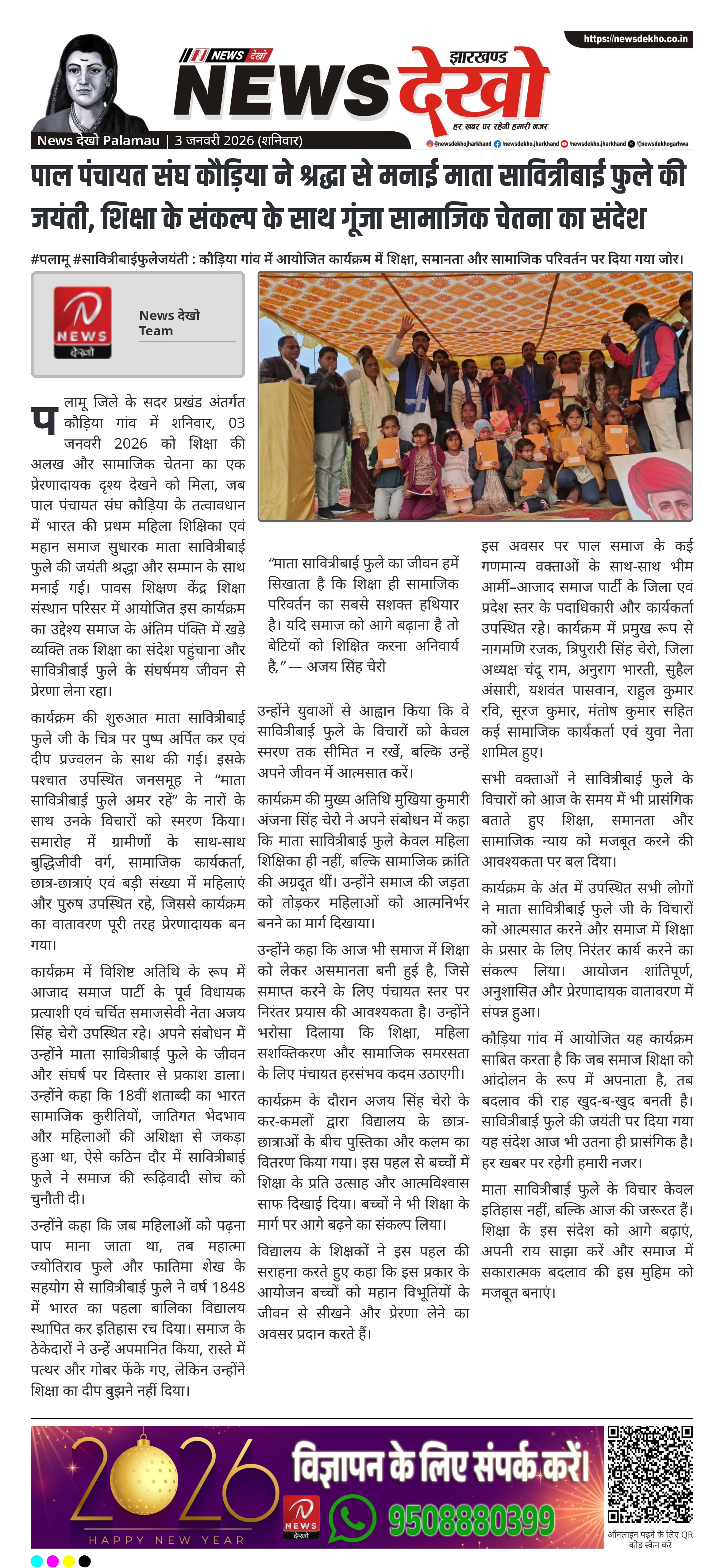 पलामू जिले के सदर प्रखंड अंतर्गत कौड़िया गांव में शनिवार, 03 जनवरी 2026 को शिक्षा की अलख और सामाजिक चेतना का एक प्रेरणादायक दृश्य देखने को मिला, जब पाल पंचायत संघ कौड़िया के तत्वावधान में भारत की प्रथम महिला शिक्षिका एवं महान समाज सुधारक माता सावित्रीबाई फुले की जयंती श्रद्धा और सम्मान के साथ मनाई गई। पावस शिक्षण केंद्र शिक्षा संस्थान परिसर में आयोजित इस कार्यक्रम का उद्देश्य समाज के अंतिम पंक्ति में खड़े व्यक्ति तक शिक्षा का संदेश पहुंचाना और सावित्रीबाई फुले के संघर्षमय जीवन से प्रेरणा लेना रहा।