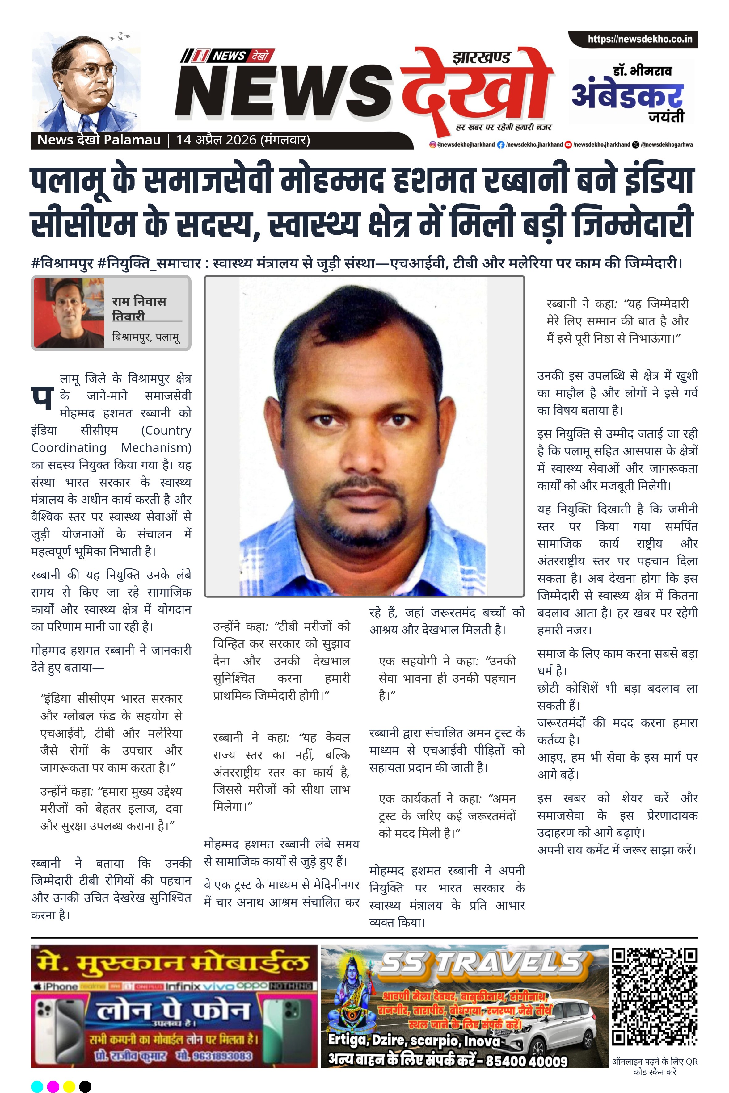 इस नियुक्ति से उम्मीद जताई जा रही है कि पलामू सहित आसपास के क्षेत्रों में स्वास्थ्य सेवाओं और जागरूकता कार्यों को और मजबूती मिलेगी।