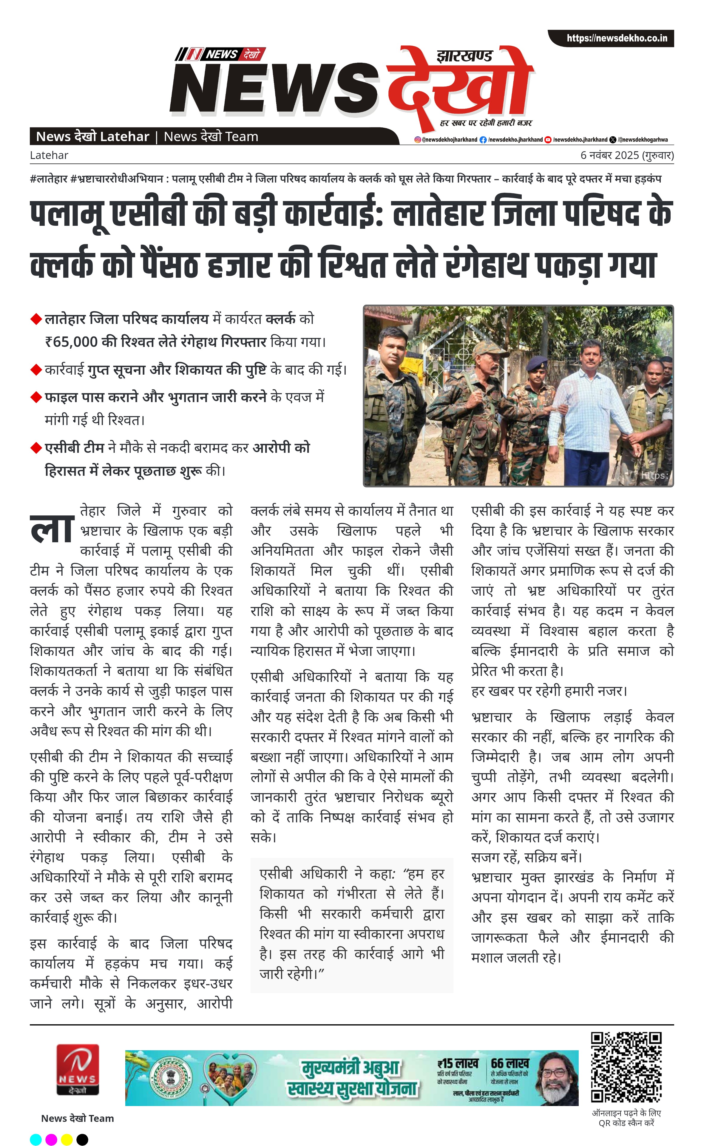 • लातेहार जिला परिषद कार्यालय में कार्यरत क्लर्क को ₹65,000 की रिश्वत लेते रंगेहाथ गिरफ्तार किया गया।