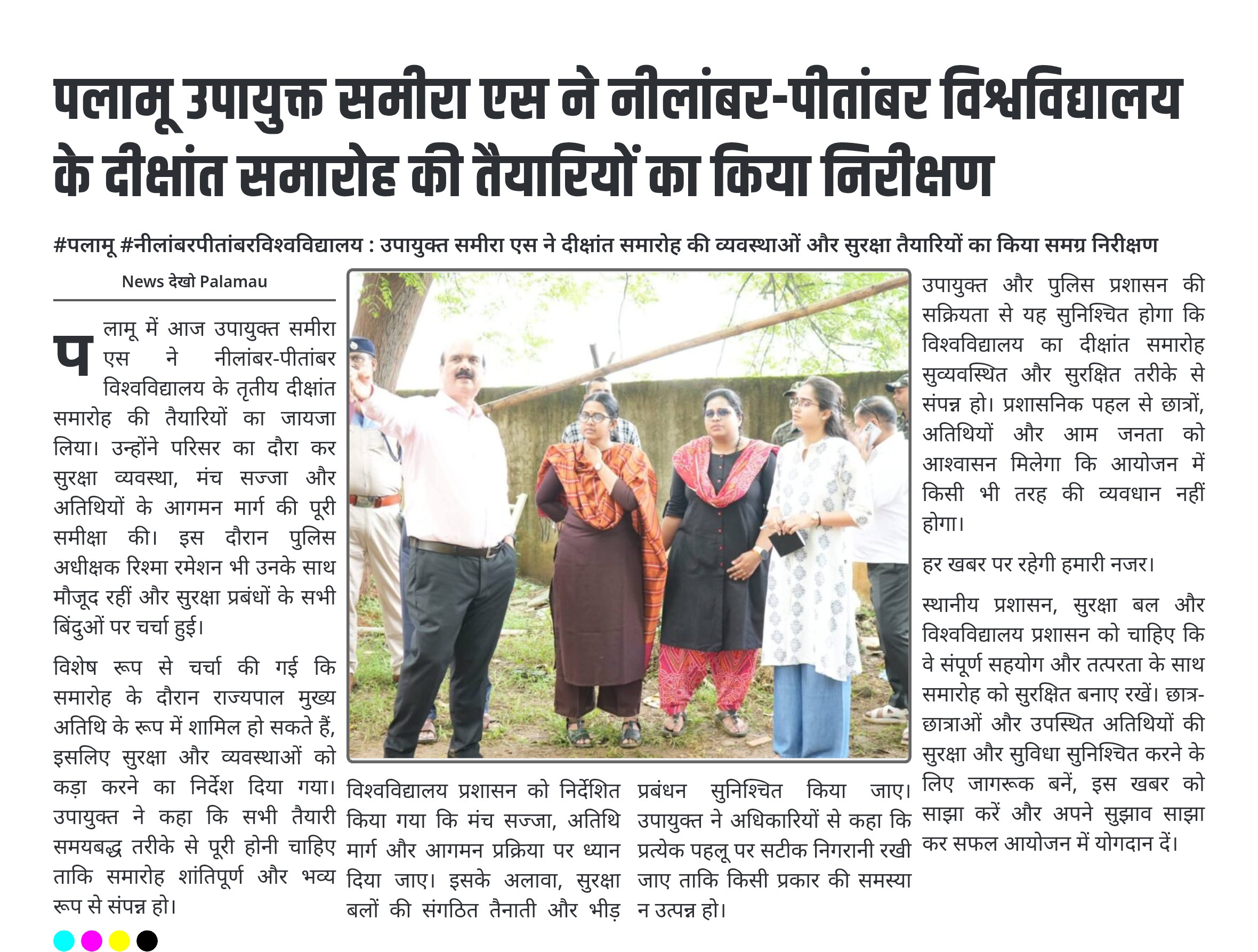 • उपायुक्त समीरा एस ने आज नीलांबर-पीतांबर विश्वविद्यालय के तृतीय दीक्षांत समारोह की तैयारियों का निरीक्षण किया।