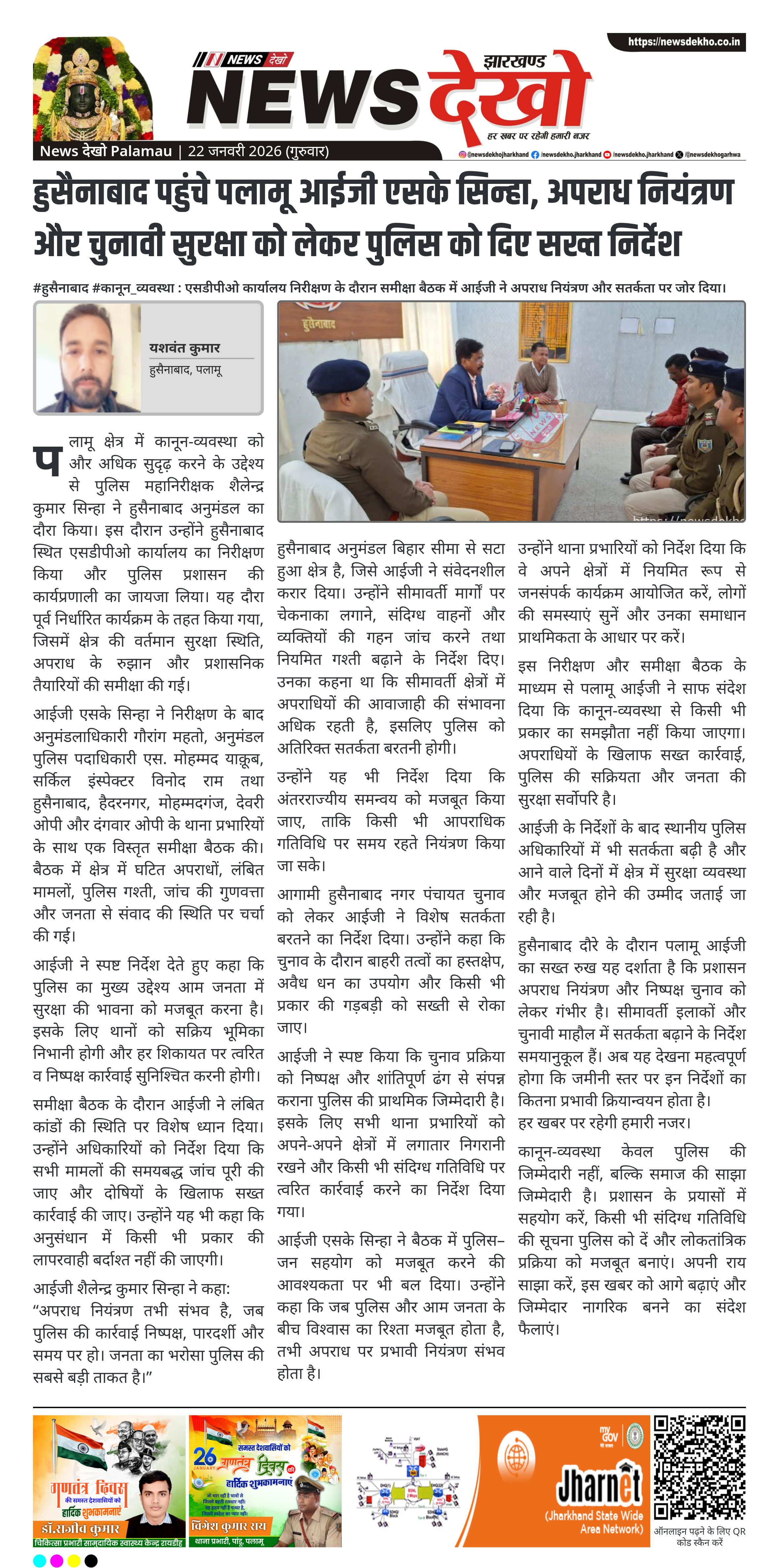 पलामू क्षेत्र के पुलिस महानिरीक्षक शैलेन्द्र कुमार सिन्हा ने हुसैनाबाद दौरे के दौरान एसडीपीओ कार्यालय का निरीक्षण कर पुलिस प्रशासन की कार्यप्रणाली की गहन समीक्षा की। इस अवसर पर उन्होंने अनुमंडल स्तर के प्रशासनिक व पुलिस अधिकारियों के साथ बैठक कर अपराध नियंत्रण, विधि-व्यवस्था और लंबित मामलों पर निर्देश दिए। बिहार सीमा से सटे संवेदनशील इलाकों में विशेष सतर्कता और चेकनाका मजबूत करने पर जोर दिया गया। आगामी नगर पंचायत चुनाव को देखते हुए बाहरी हस्तक्षेप और अवैध गतिविधियों पर कड़ी नजर रखने के निर्देश भी दिए गए।