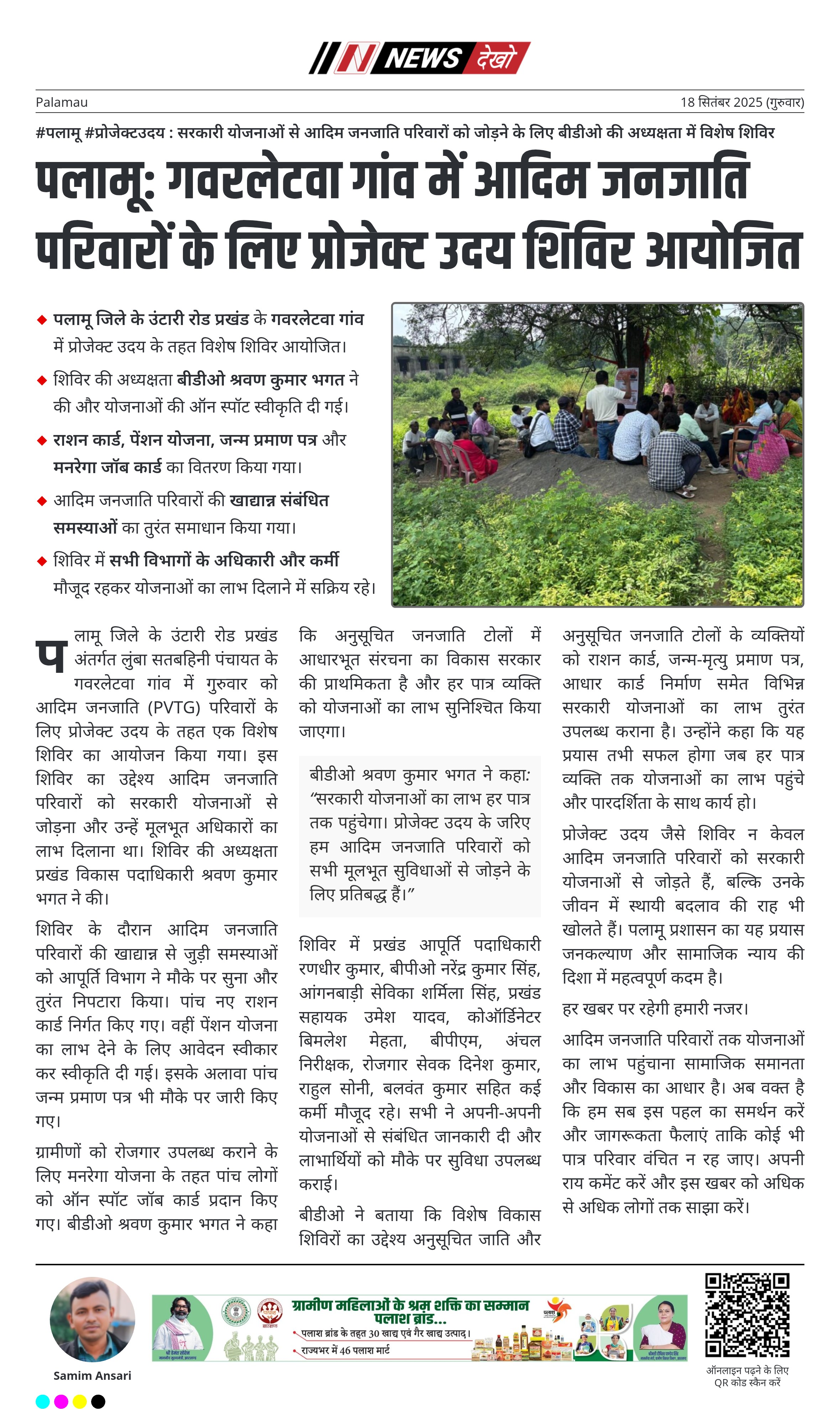 • पलामू जिले के उंटारी रोड प्रखंड के गवरलेटवा गांव में प्रोजेक्ट उदय के तहत विशेष शिविर आयोजित।