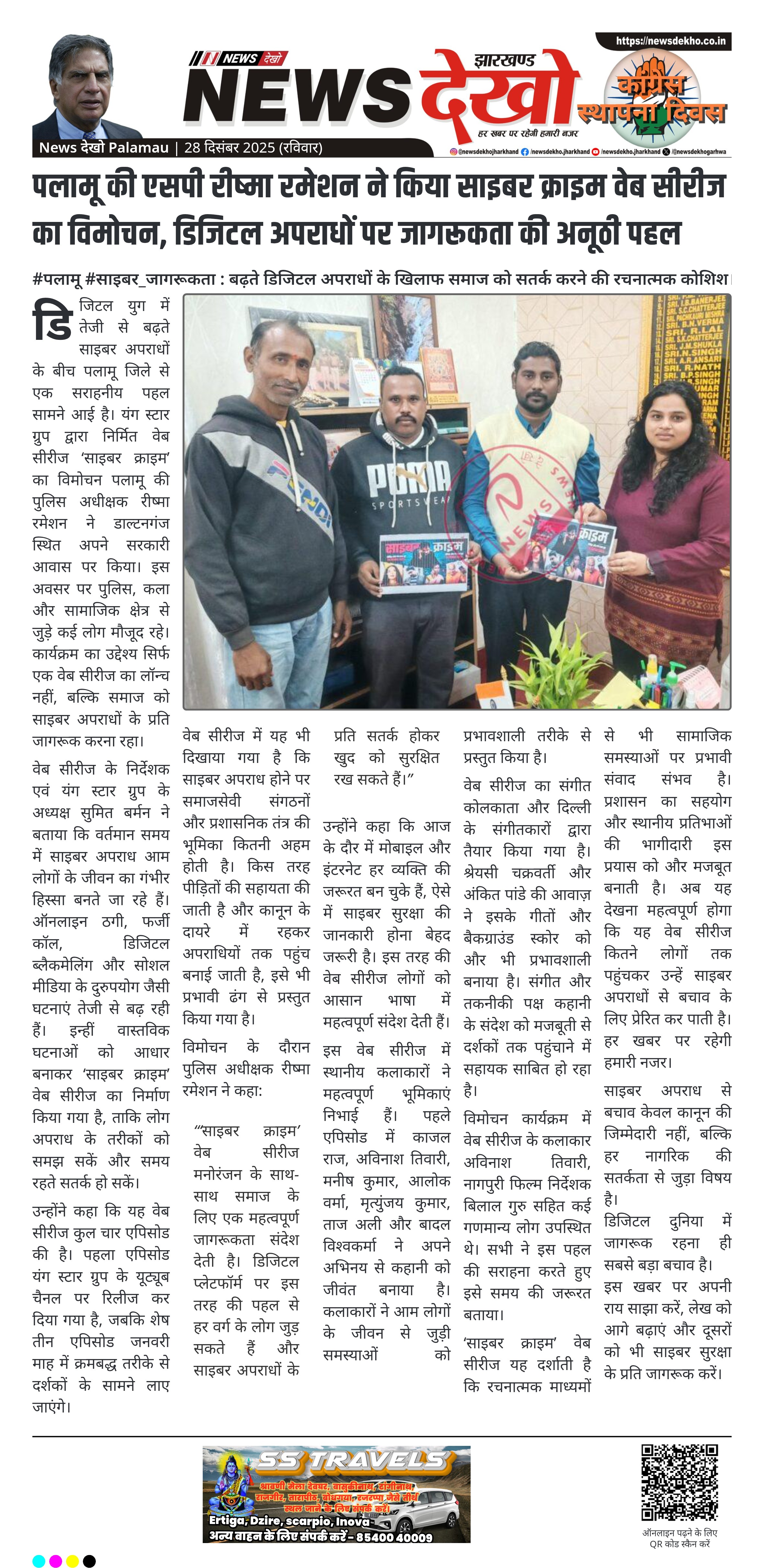 डिजिटल युग में तेजी से बढ़ते साइबर अपराधों के बीच पलामू जिले से एक सराहनीय पहल सामने आई है। यंग स्टार ग्रुप द्वारा निर्मित वेब सीरीज ‘साइबर क्राइम’ का विमोचन पलामू की पुलिस अधीक्षक रीष्मा रमेशन ने डाल्टनगंज स्थित अपने सरकारी आवास पर किया। इस अवसर पर पुलिस, कला और सामाजिक क्षेत्र से जुड़े कई लोग मौजूद रहे। कार्यक्रम का उद्देश्य सिर्फ एक वेब सीरीज का लॉन्च नहीं, बल्कि समाज को साइबर अपराधों के प्रति जागरूक करना रहा।
