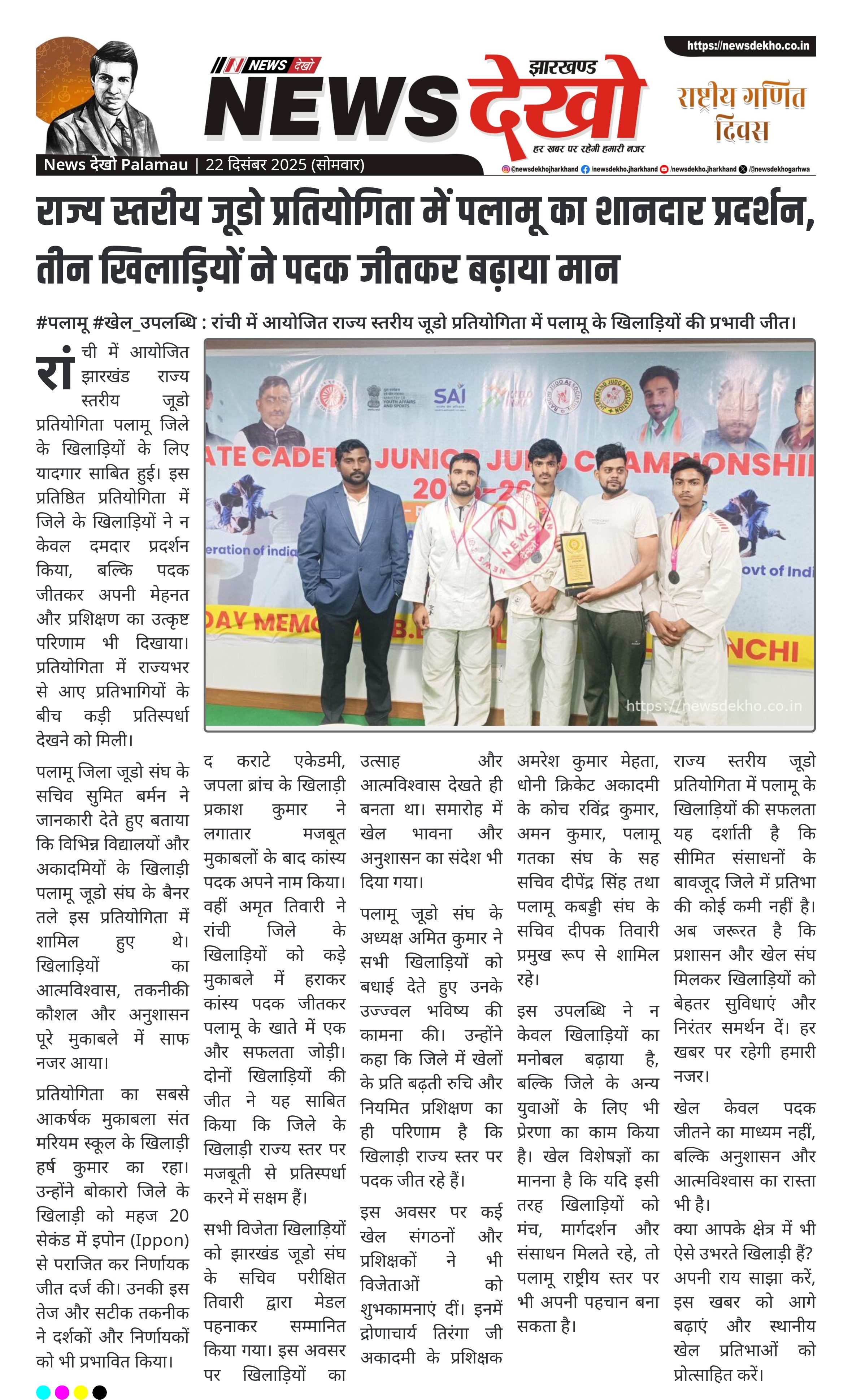 - राज्य स्तरीय जूडो प्रतियोगिता का आयोजन रांची में 20–21 दिसंबर को हुआ।