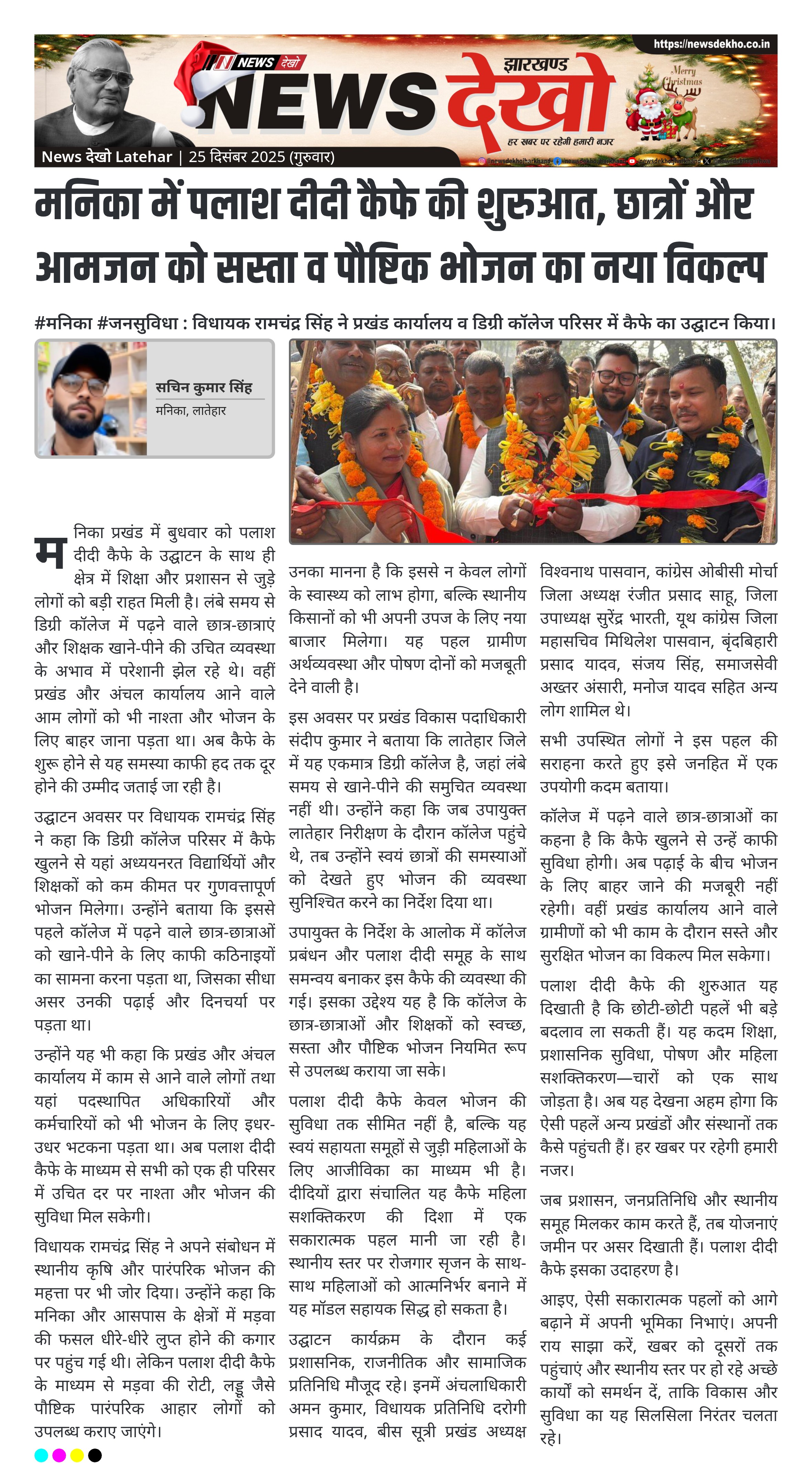 लातेहार जिले के मनिका प्रखंड में जनसुविधाओं के विस्तार की दिशा में एक महत्वपूर्ण पहल की गई है। मनिका विधानसभा क्षेत्र के विधायक रामचंद्र सिंह ने प्रखंड कार्यालय परिसर और डिग्री कॉलेज में पलाश दीदी कैफे का उद्घाटन किया। इस कैफे के माध्यम से छात्रों, शिक्षकों, अधिकारियों और आम नागरिकों को उचित दर पर नाश्ता और भोजन उपलब्ध कराया जाएगा। यह पहल न केवल सुविधा बढ़ाने वाली है, बल्कि स्थानीय पोषक खाद्य परंपराओं को भी बढ़ावा देने वाली मानी जा रही है।