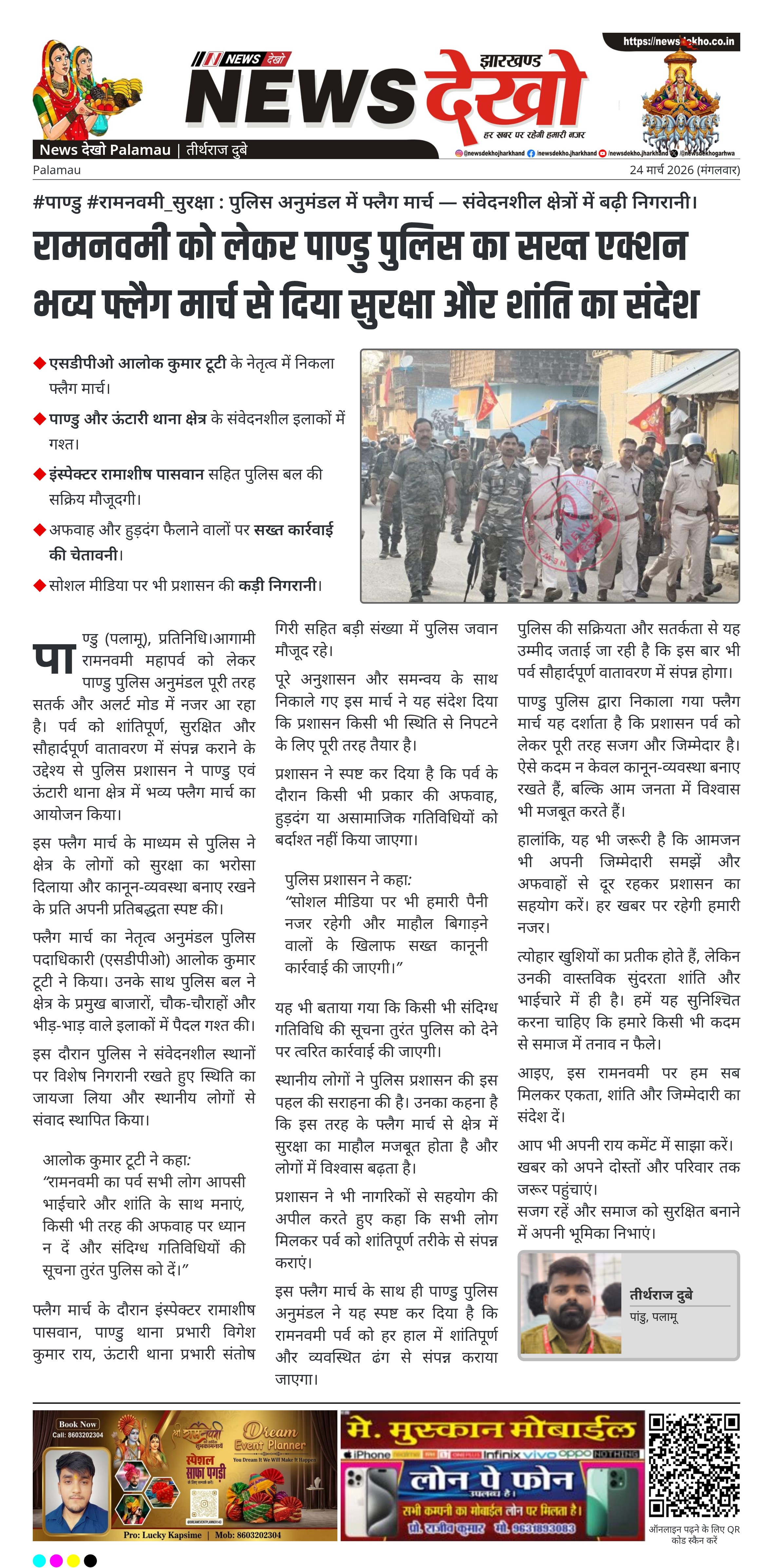 पलामू जिले के पाण्डु पुलिस अनुमंडल में रामनवमी पर्व को लेकर सुरक्षा व्यवस्था कड़ी कर दी गई है। एसडीपीओ आलोक कुमार टूटी के नेतृत्व में पाण्डु और ऊंटारी थाना क्षेत्र में फ्लैग मार्च निकाला गया। पुलिस ने संवेदनशील इलाकों में गश्त कर आमजन को शांति और भाईचारे के साथ पर्व मनाने की अपील की। प्रशासन ने अफवाह और असामाजिक गतिविधियों पर सख्त कार्रवाई की चेतावनी दी है।