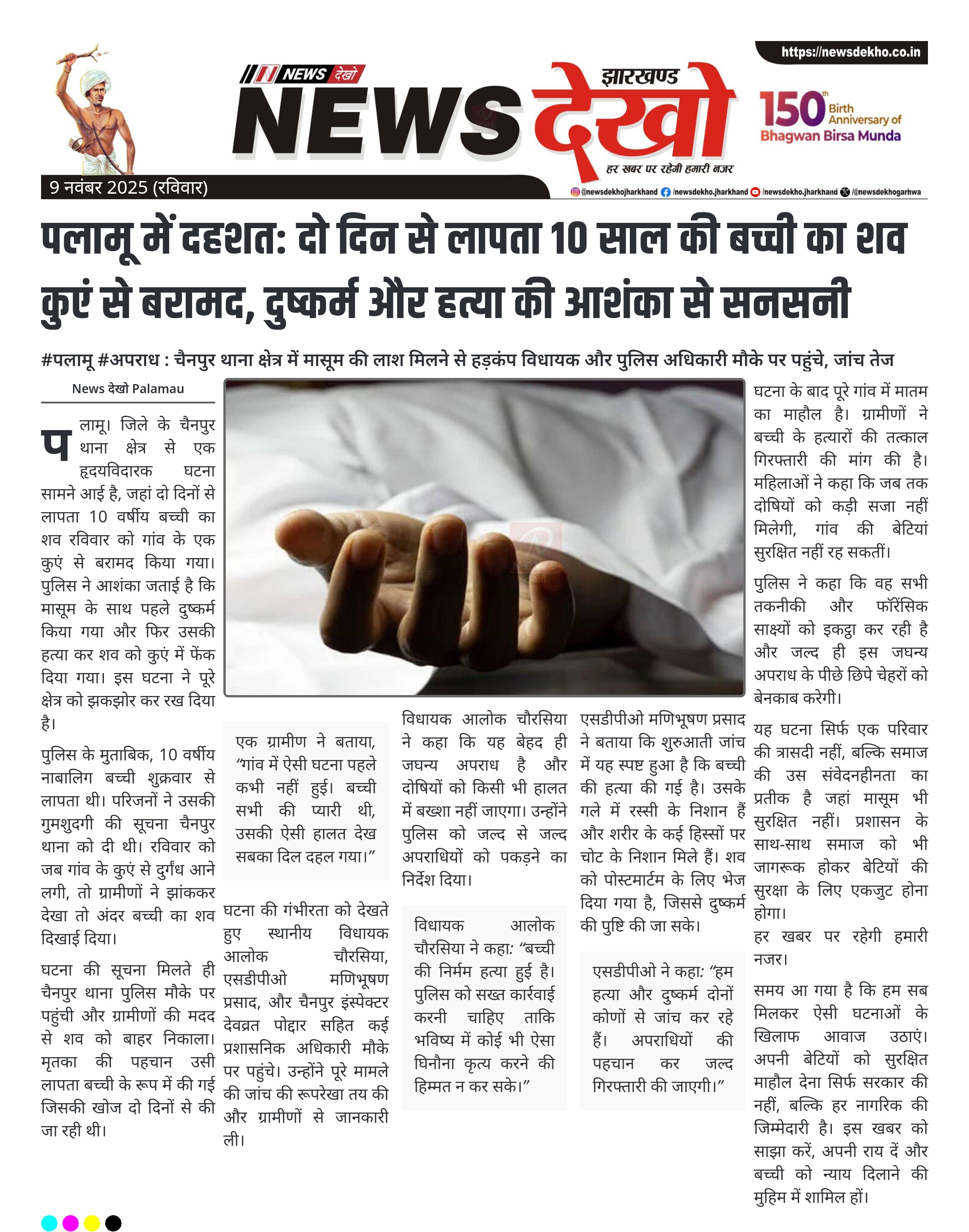 पलामू। जिले के चैनपुर थाना क्षेत्र से एक हृदयविदारक घटना सामने आई है, जहां दो दिनों से लापता 10 वर्षीय बच्ची का शव रविवार को गांव के एक कुएं से बरामद किया गया। पुलिस ने आशंका जताई है कि मासूम के साथ पहले दुष्कर्म किया गया और फिर उसकी हत्या कर शव को कुएं में फेंक दिया गया। इस घटना ने पूरे क्षेत्र को झकझोर कर रख दिया है।