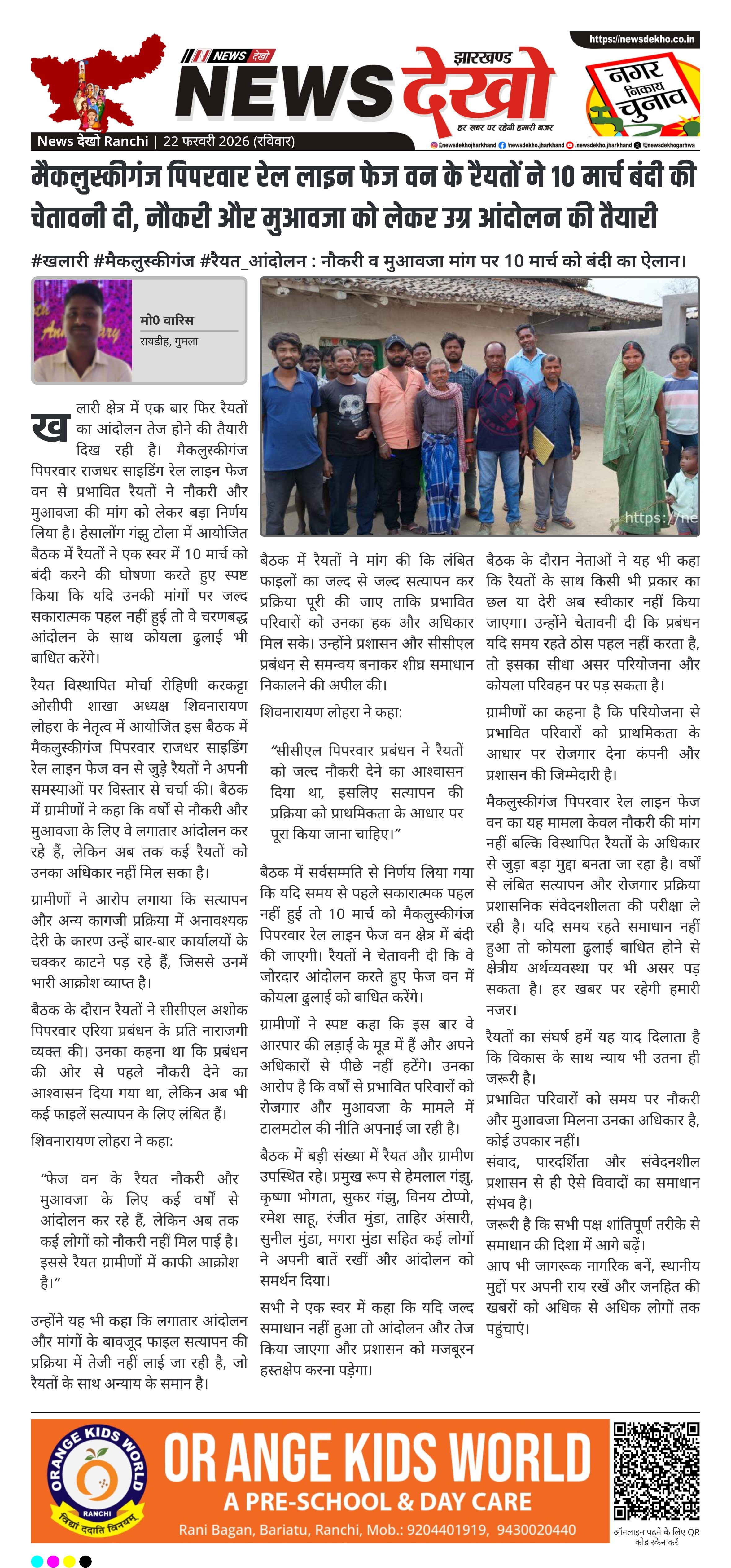 - नेतृत्व में शिवनारायण लोहरा, अध्यक्ष रैयत विस्थापित मोर्चा रोहिणी करकट्टा ओसीपी शाखा।