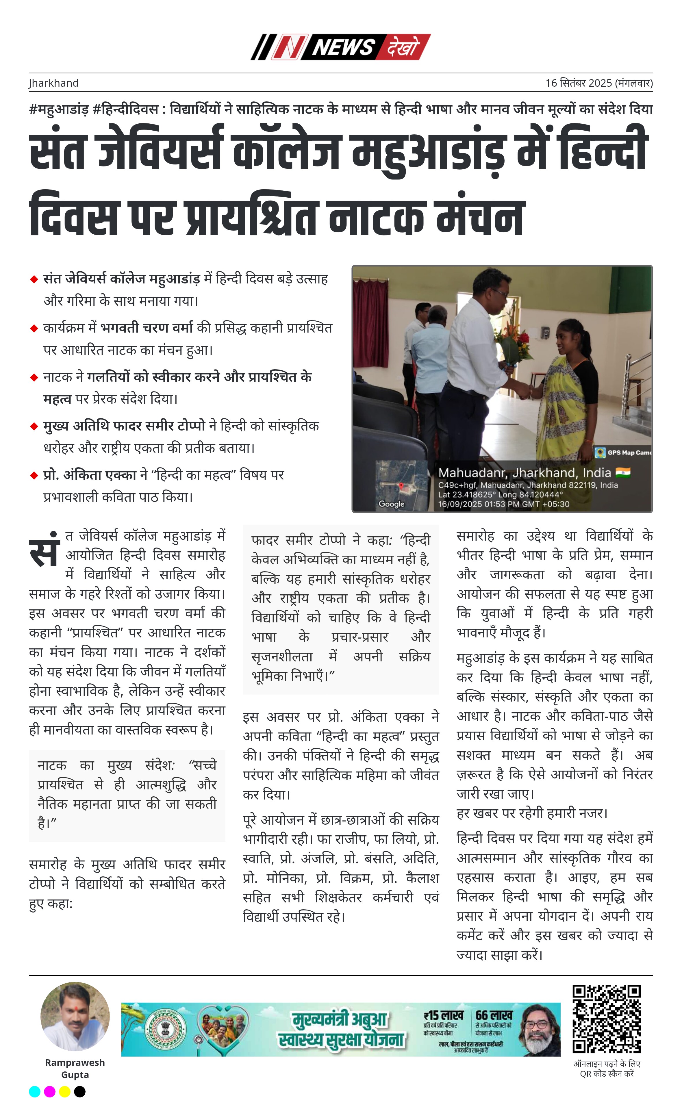 - संत जेवियर्स कॉलेज महुआडांड़ में हिन्दी दिवस बड़े उत्साह और गरिमा के साथ मनाया गया।