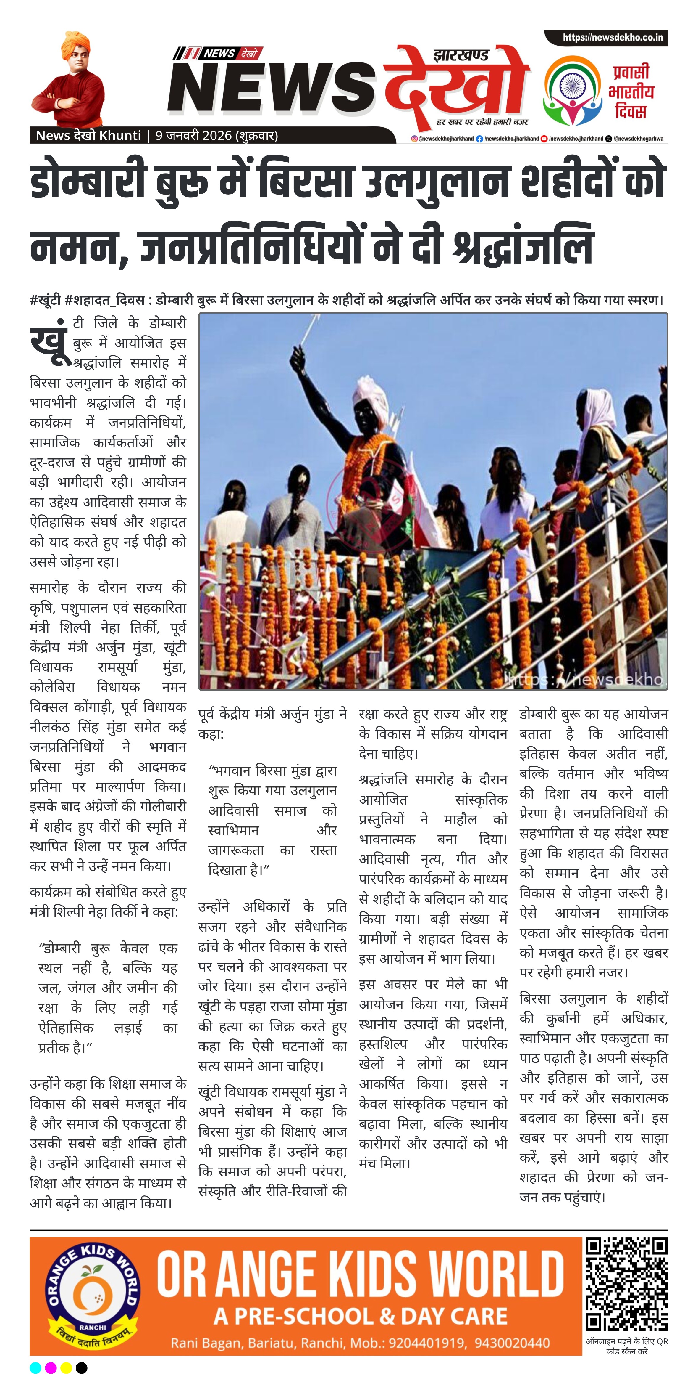 बिरसा उलगुलान के शहीदों की कुर्बानी हमें अधिकार, स्वाभिमान और एकजुटता का पाठ पढ़ाती है। अपनी संस्कृति और इतिहास को जानें, उस पर गर्व करें और सकारात्मक बदलाव का हिस्सा बनें। इस खबर पर अपनी राय साझा करें, इसे आगे बढ़ाएं और शहादत की प्रेरणा को जन-जन तक पहुंचाएं।