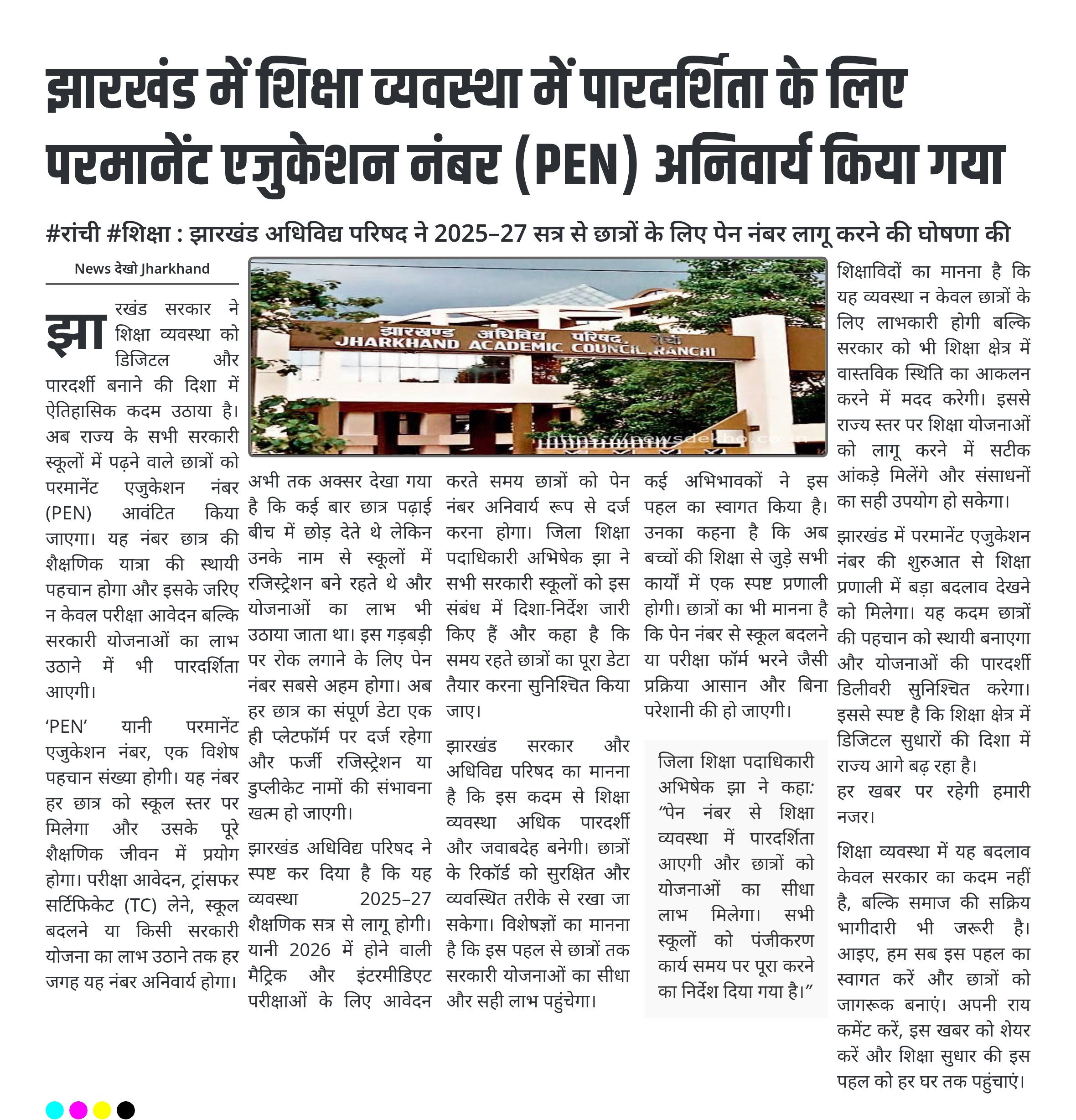 #रांची #शिक्षा : झारखंड अधिविद्य परिषद ने 2025–27 सत्र से छात्रों के लिए पेन नंबर लागू करने की घोषणा की