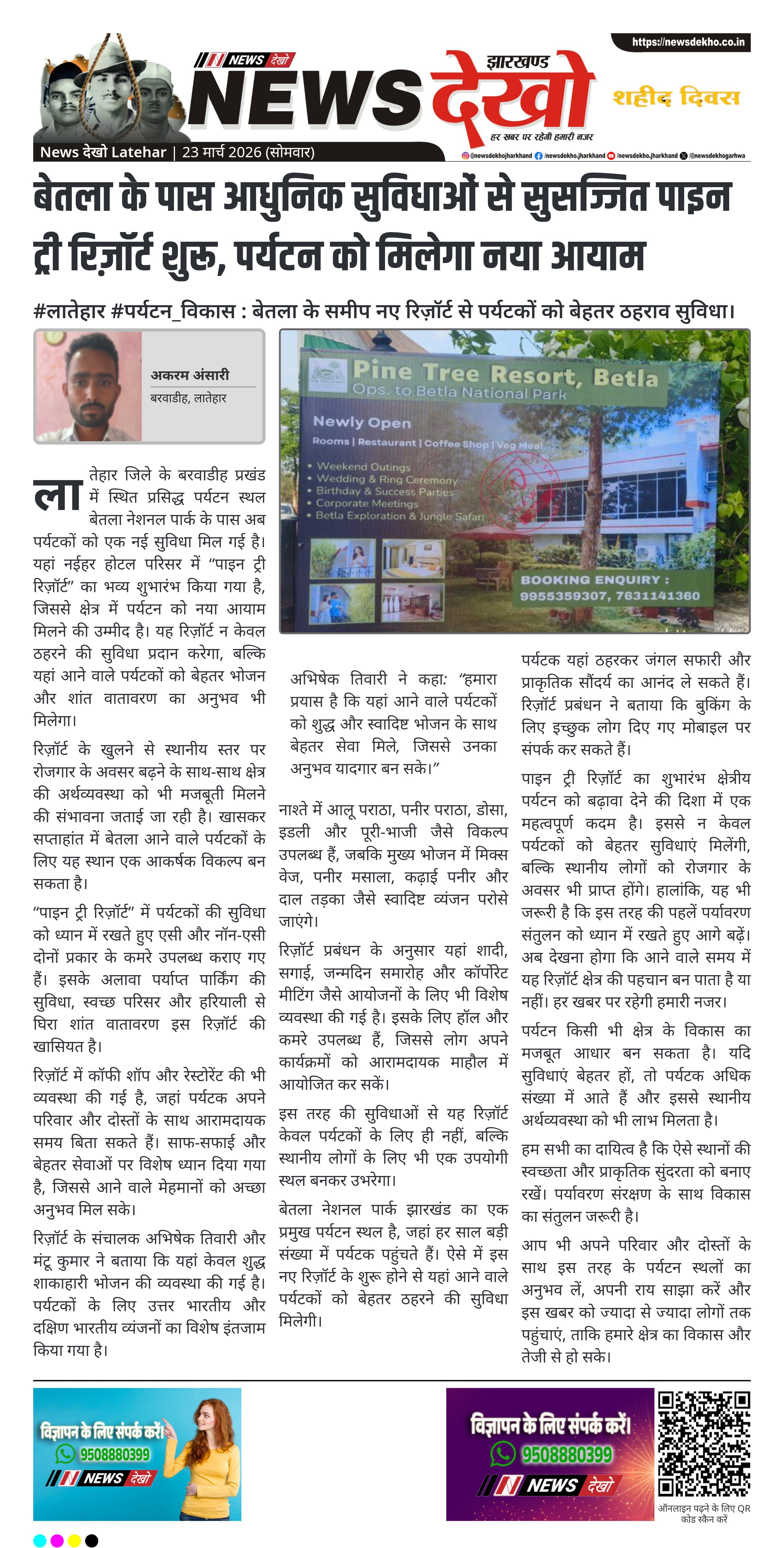 लातेहार जिले के बरवाडीह स्थित बेतला नेशनल पार्क के समीप पाइन ट्री रिज़ॉर्ट का विधिवत शुभारंभ किया गया। इस रिज़ॉर्ट में पर्यटकों के लिए आधुनिक ठहरने की सुविधा और शुद्ध शाकाहारी भोजन की व्यवस्था की गई है। संचालकों के अनुसार यह पहल क्षेत्र में पर्यटन को बढ़ावा देने के उद्देश्य से की गई है। स्थानीय स्तर पर रोजगार और सुविधाओं के विस्तार में भी इससे मदद मिलने की उम्मीद जताई जा रही है।