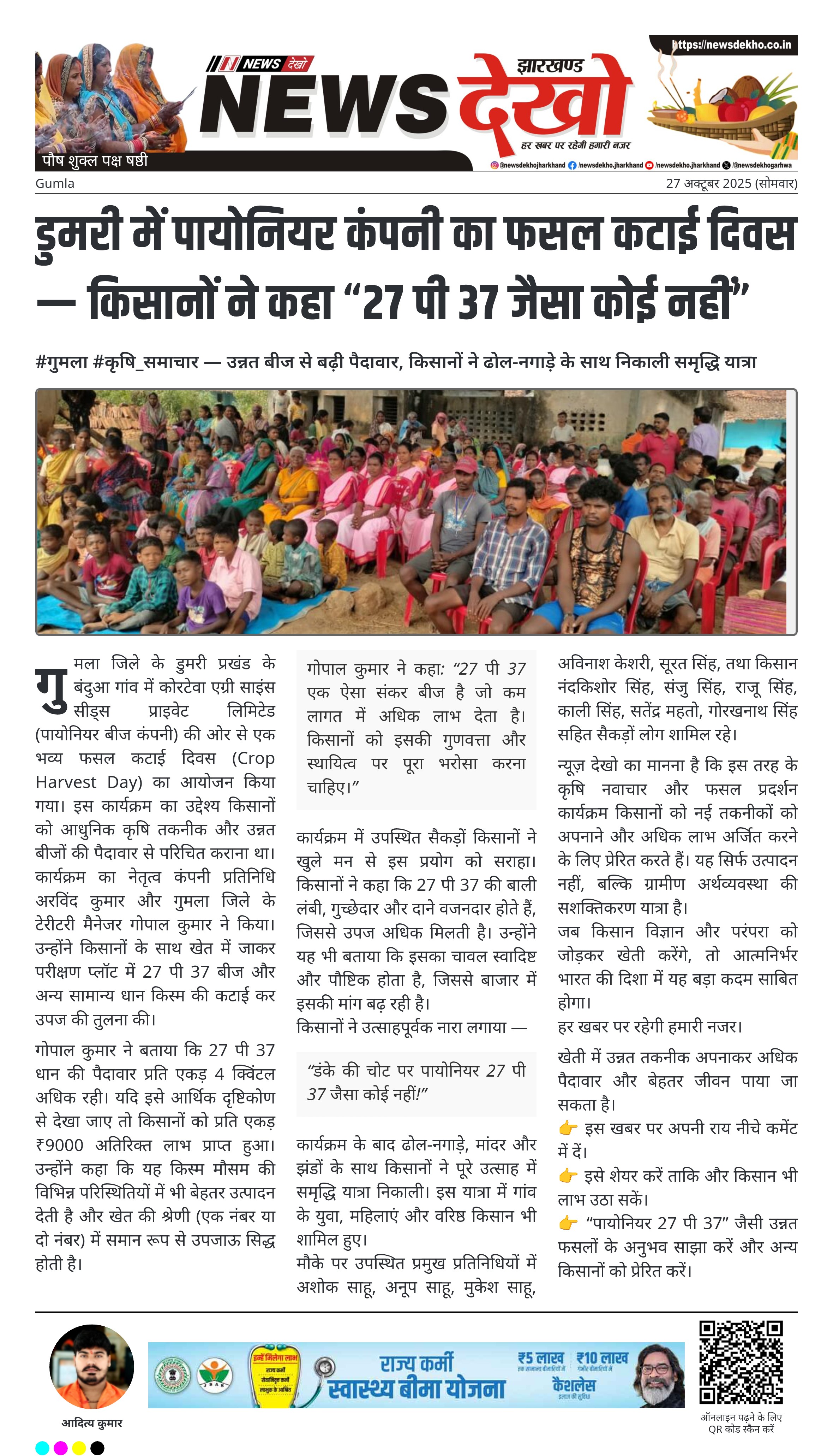 - पायोनियर बीज कंपनी (Corteva Agri Science) ने डुमरी प्रखंड के बंदुआ गांव में किया फसल कटाई दिवस का आयोजन