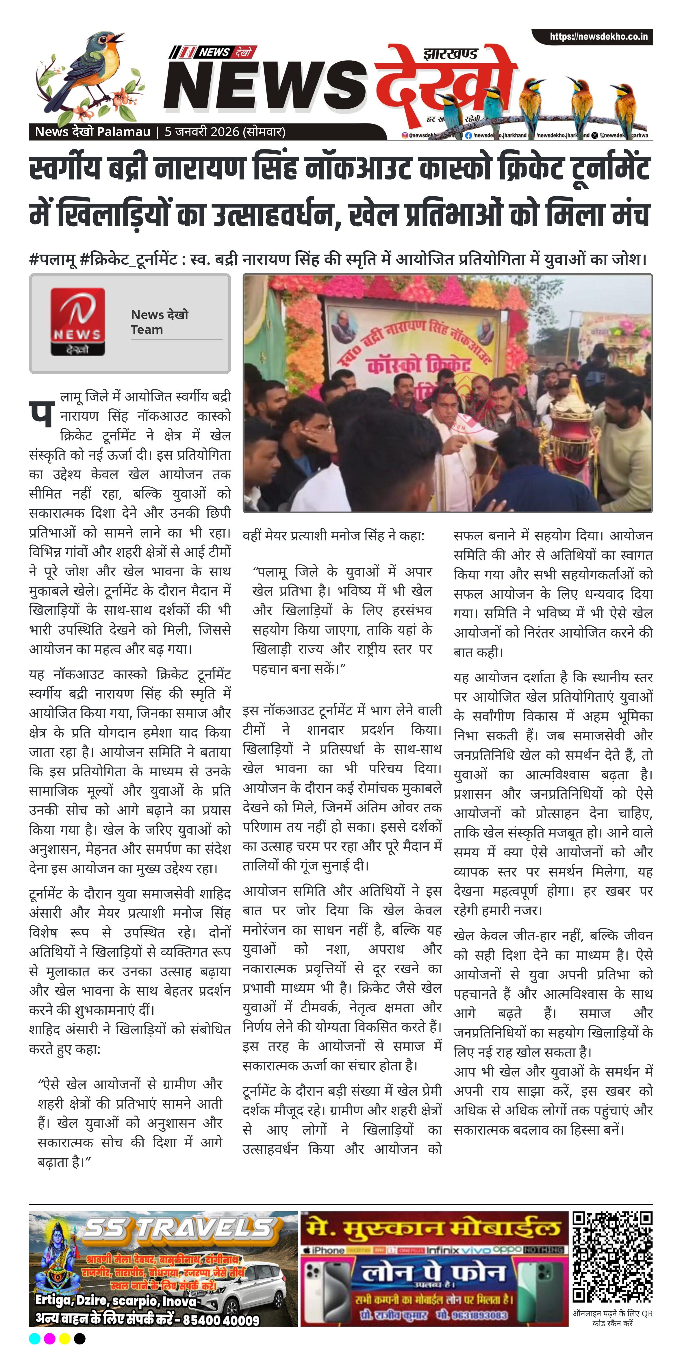 पलामू जिले में स्वर्गीय बद्री नारायण सिंह की स्मृति में आयोजित नॉकआउट कास्को क्रिकेट टूर्नामेंट ने क्षेत्रीय खेल प्रतिभाओं को मंच प्रदान किया। प्रतियोगिता के दौरान युवा समाजसेवी शाहिद अंसारी और मेयर प्रत्याशी मनोज सिंह ने खिलाड़ियों से मुलाकात कर उनका उत्साह बढ़ाया। टूर्नामेंट में विभिन्न टीमों की भागीदारी से खेल प्रेमियों में खासा उत्साह देखने को मिला। आयोजन का उद्देश्य युवाओं को खेल के प्रति प्रेरित करना और अनुशासित प्रतिस्पर्धा को बढ़ावा देना रहा।
