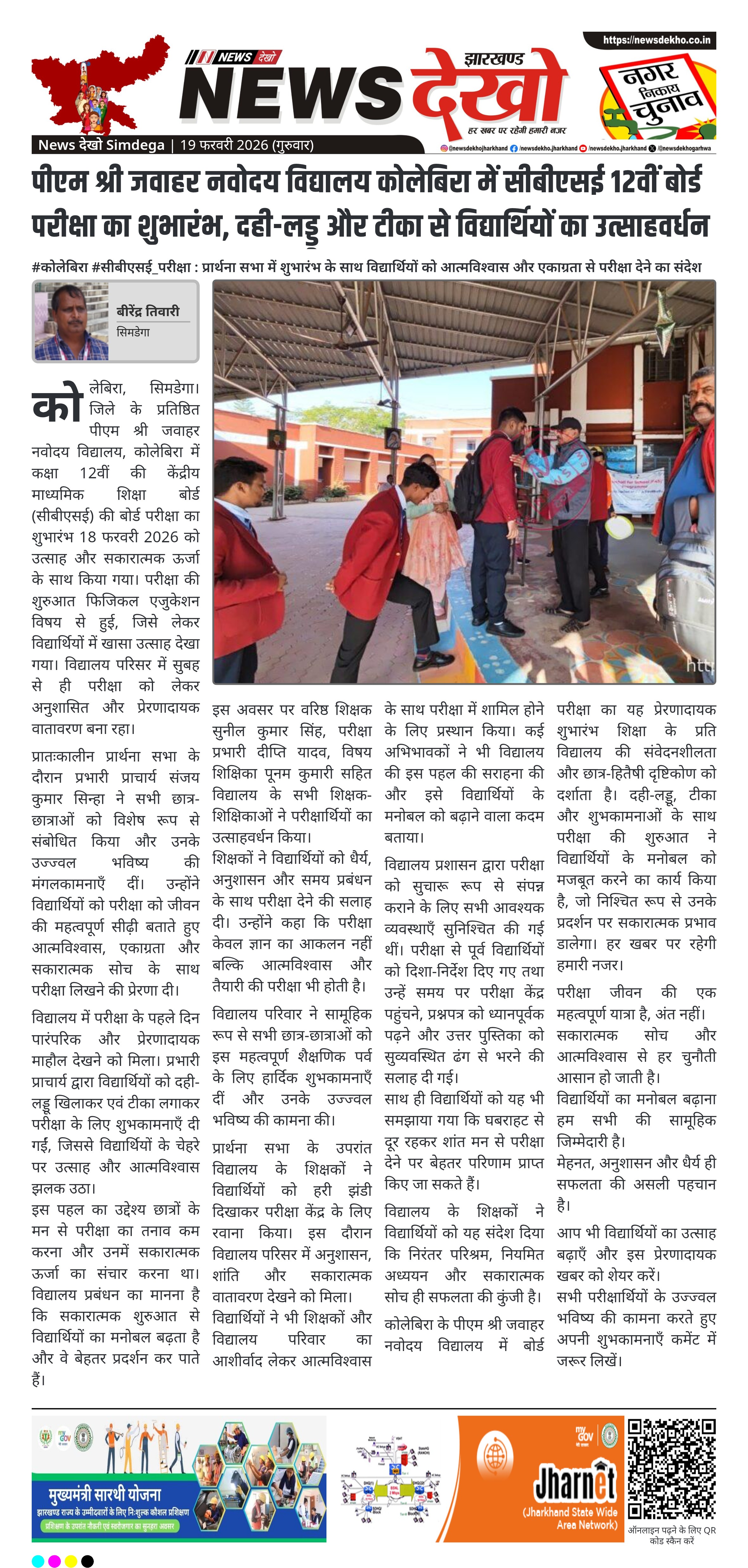 सिमडेगा जिले के कोलेबिरा स्थित पीएम श्री जवाहर नवोदय विद्यालय में 18 फरवरी 2026 से कक्षा 12वीं की केंद्रीय माध्यमिक शिक्षा बोर्ड परीक्षा का विधिवत शुभारंभ किया गया। विद्यालय परिसर में सकारात्मक और उत्साहपूर्ण माहौल के बीच विद्यार्थियों को दही-लड्डू खिलाकर, टीका लगाकर शुभकामनाएँ दी गईं तथा आत्मविश्वास के साथ परीक्षा देने के लिए प्रेरित किया गया।