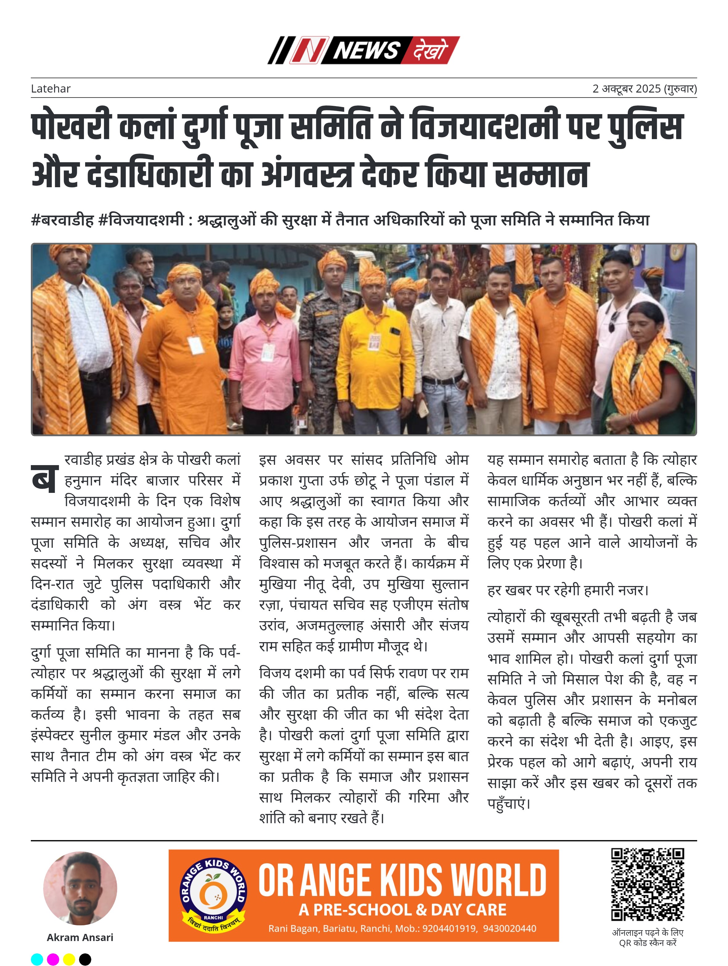 विजय दशमी का पर्व सिर्फ रावण पर राम की जीत का प्रतीक नहीं, बल्कि सत्य और सुरक्षा की जीत का भी संदेश देता है। पोखरी कलां दुर्गा पूजा समिति द्वारा सुरक्षा में लगे कर्मियों का सम्मान इस बात का प्रतीक है कि समाज और प्रशासन साथ मिलकर त्योहारों की गरिमा और शांति को बनाए रखते हैं।