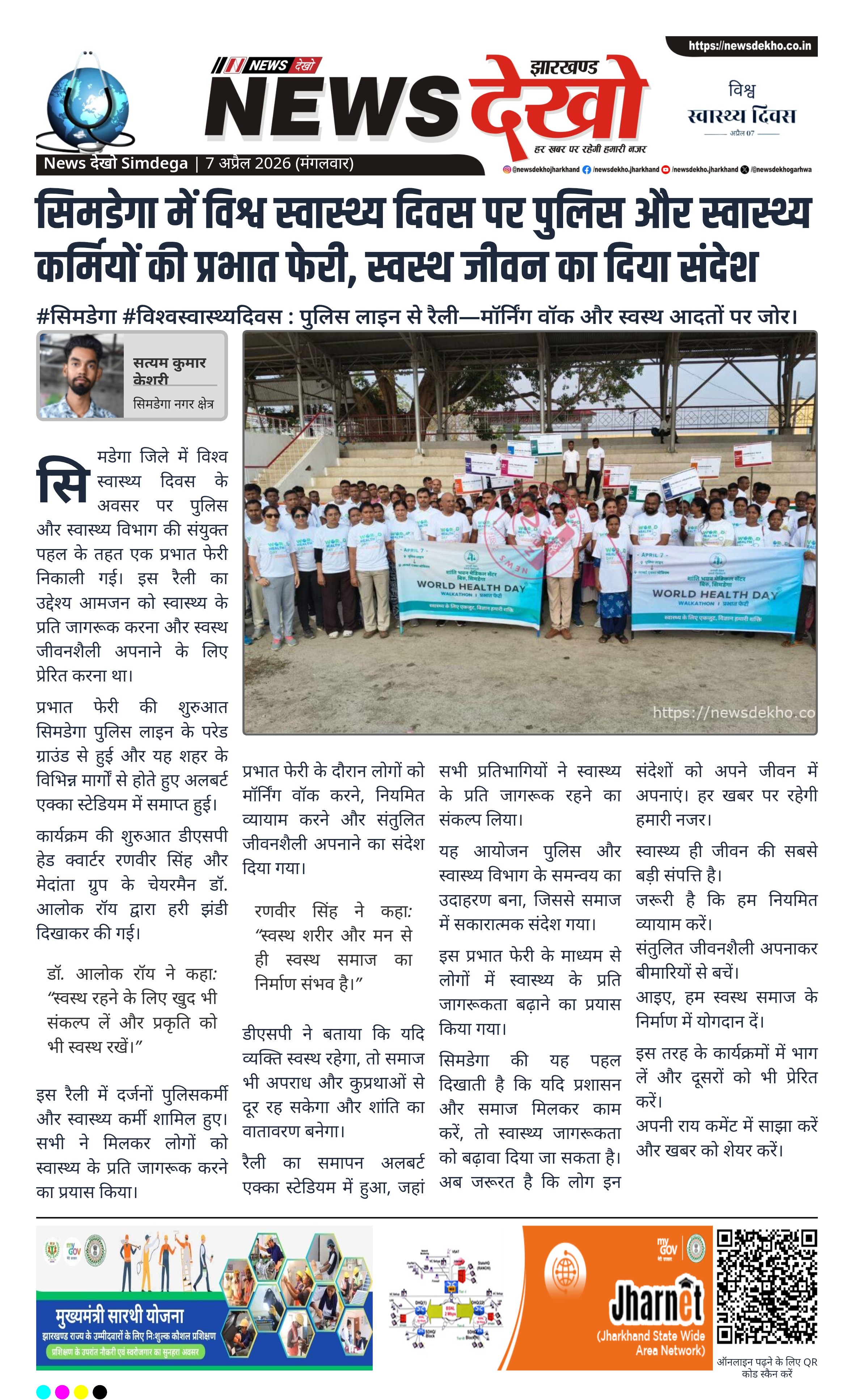 सिमडेगा जिले में विश्व स्वास्थ्य दिवस के अवसर पर पुलिस और स्वास्थ्य विभाग की संयुक्त पहल के तहत एक प्रभात फेरी निकाली गई। इस रैली का उद्देश्य आमजन को स्वास्थ्य के प्रति जागरूक करना और स्वस्थ जीवनशैली अपनाने के लिए प्रेरित करना था।