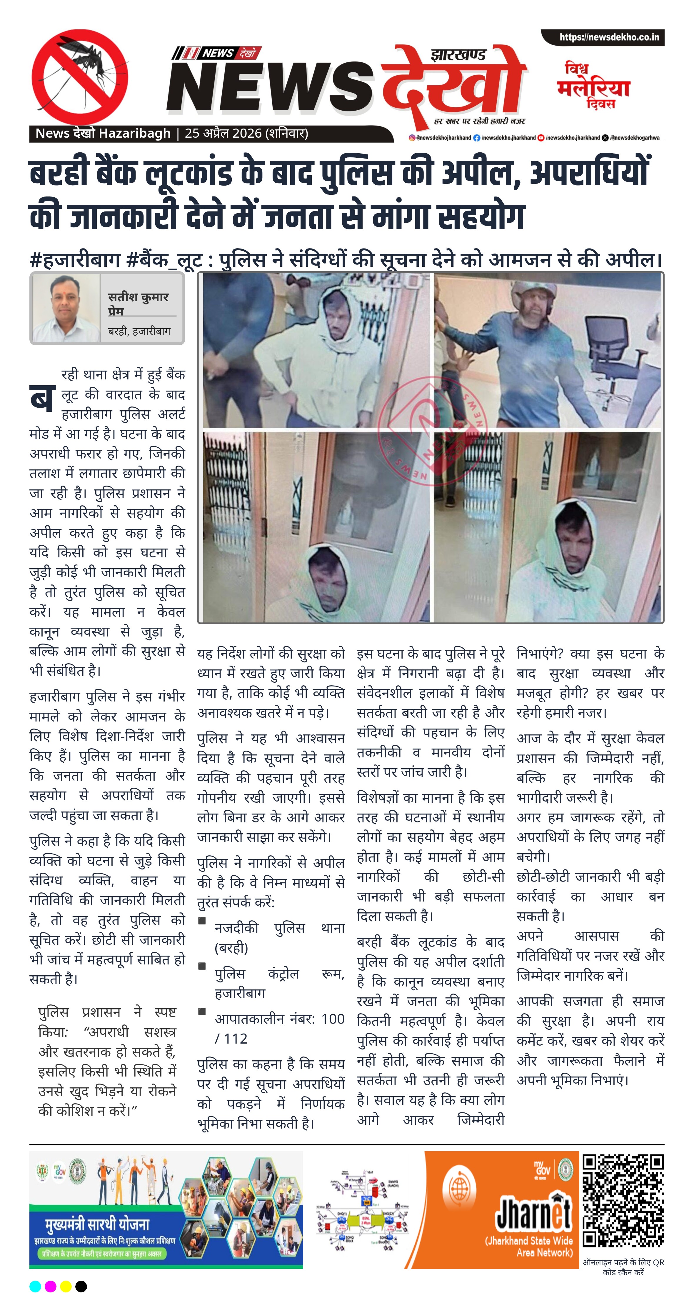 हजारीबाग जिले के बरही थाना क्षेत्र में 24 अप्रैल 2026 को हुई बैंक लूट की घटना के बाद पुलिस ने अपराधियों की तलाश तेज कर दी है। इस मामले में आम नागरिकों से सहयोग की अपील करते हुए संदिग्धों की सूचना देने का आग्रह किया गया है। पुलिस का कहना है कि जनता की मदद से जल्द आरोपियों तक पहुंचा जा सकता है। सुरक्षा को ध्यान में रखते हुए लोगों को सावधानी बरतने की सलाह भी दी गई है।