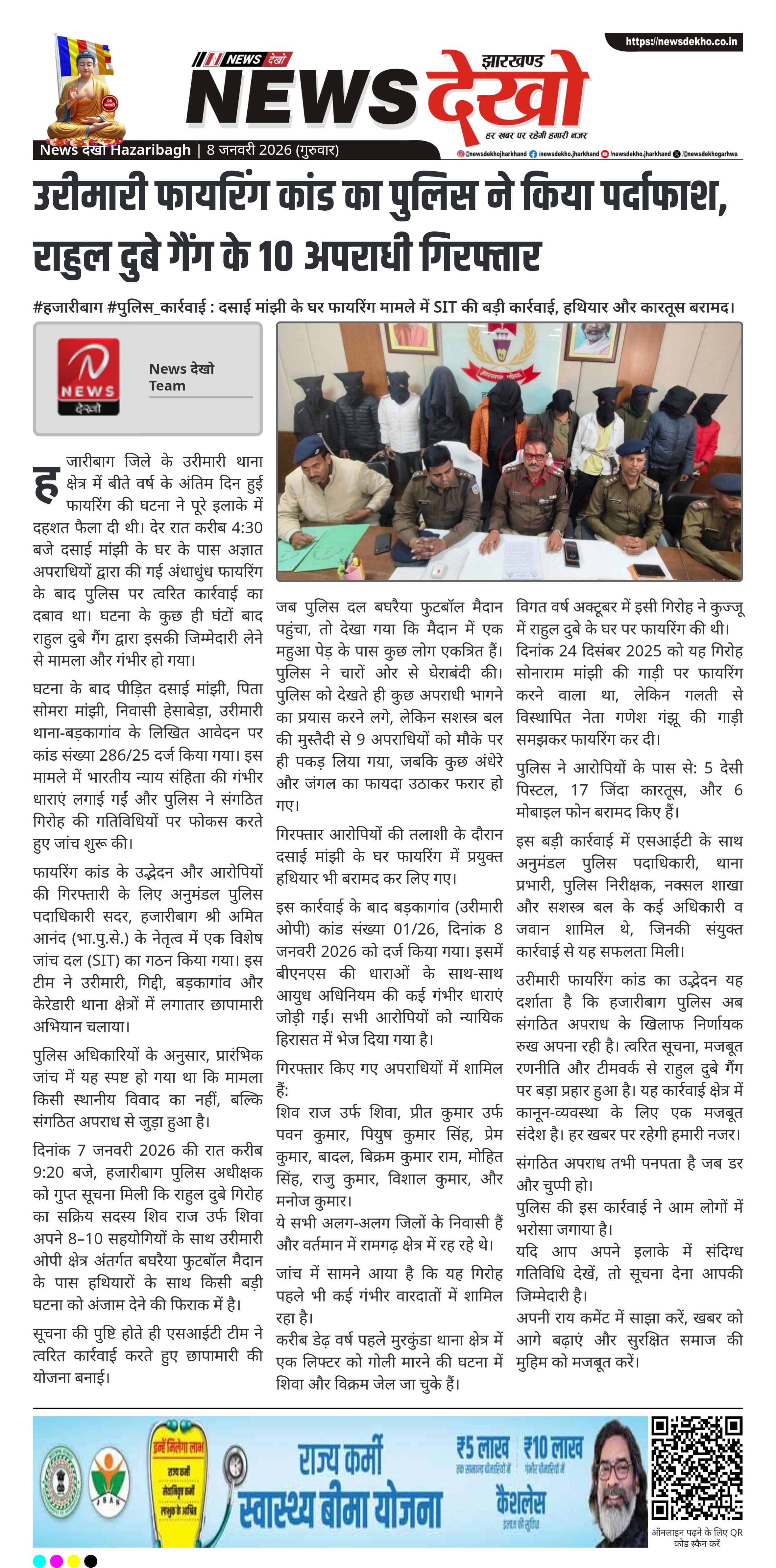 उरीमारी फायरिंग कांड का उद्भेदन यह दर्शाता है कि हजारीबाग पुलिस अब संगठित अपराध के खिलाफ निर्णायक रुख अपना रही है। त्वरित सूचना, मजबूत रणनीति और टीमवर्क से राहुल दुबे गैंग पर बड़ा प्रहार हुआ है। यह कार्रवाई क्षेत्र में कानून-व्यवस्था के लिए एक मजबूत संदेश है। हर खबर पर रहेगी हमारी नजर।