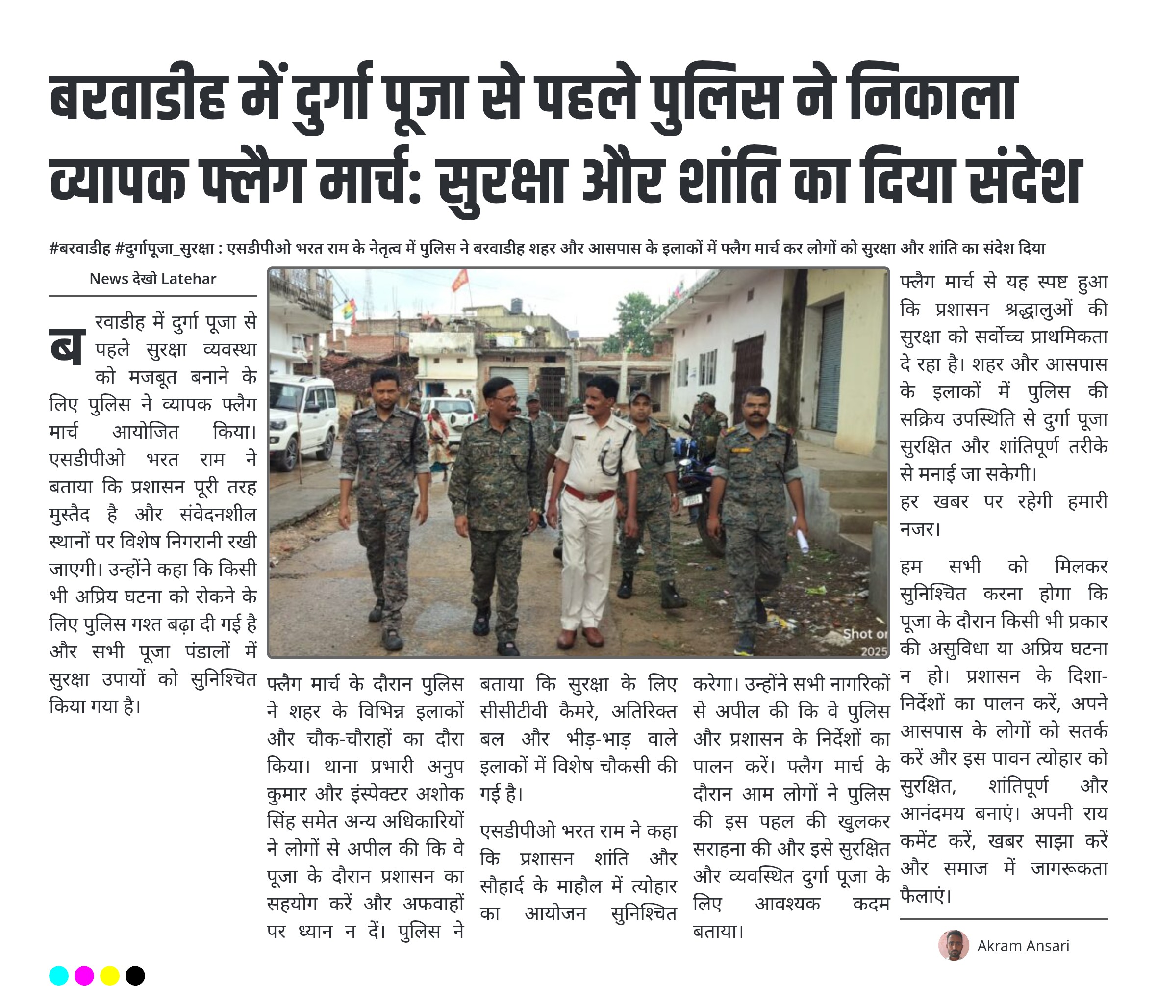 • एसडीपीओ भरत राम के नेतृत्व में पुलिस ने दुर्गा पूजा के मद्देनजर शहर और आसपास के इलाकों में फ्लैग मार्च निकाला।