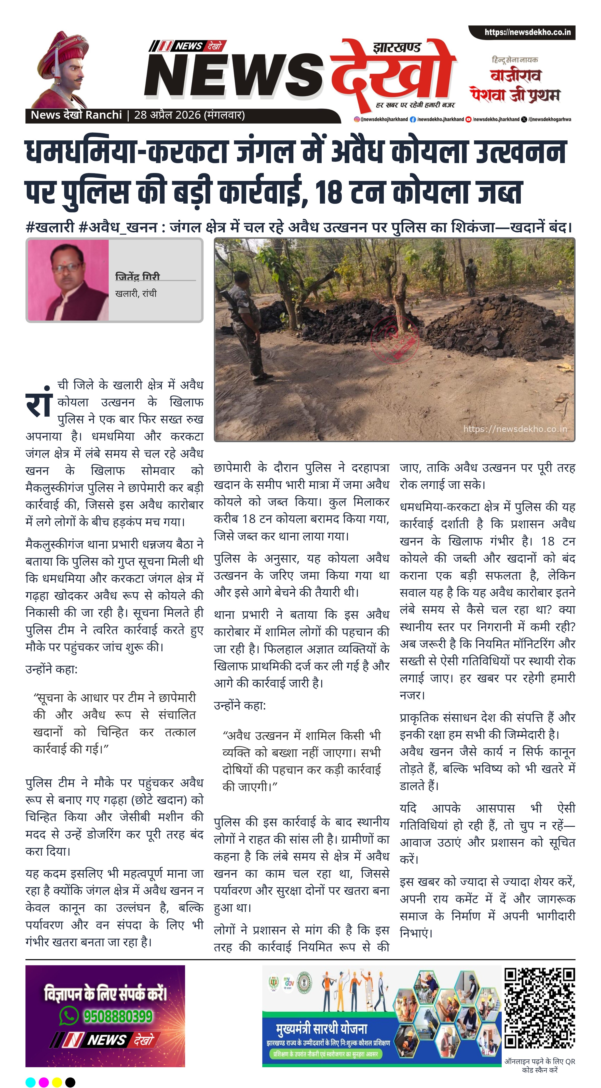 रांची जिले के खलारी क्षेत्र में अवैध कोयला उत्खनन के खिलाफ पुलिस ने एक बार फिर सख्त रुख अपनाया है। धमधमिया और करकटा जंगल क्षेत्र में लंबे समय से चल रहे अवैध खनन के खिलाफ सोमवार को मैकलुस्कीगंज पुलिस ने छापेमारी कर बड़ी कार्रवाई की, जिससे इस अवैध कारोबार में लगे लोगों के बीच हड़कंप मच गया।