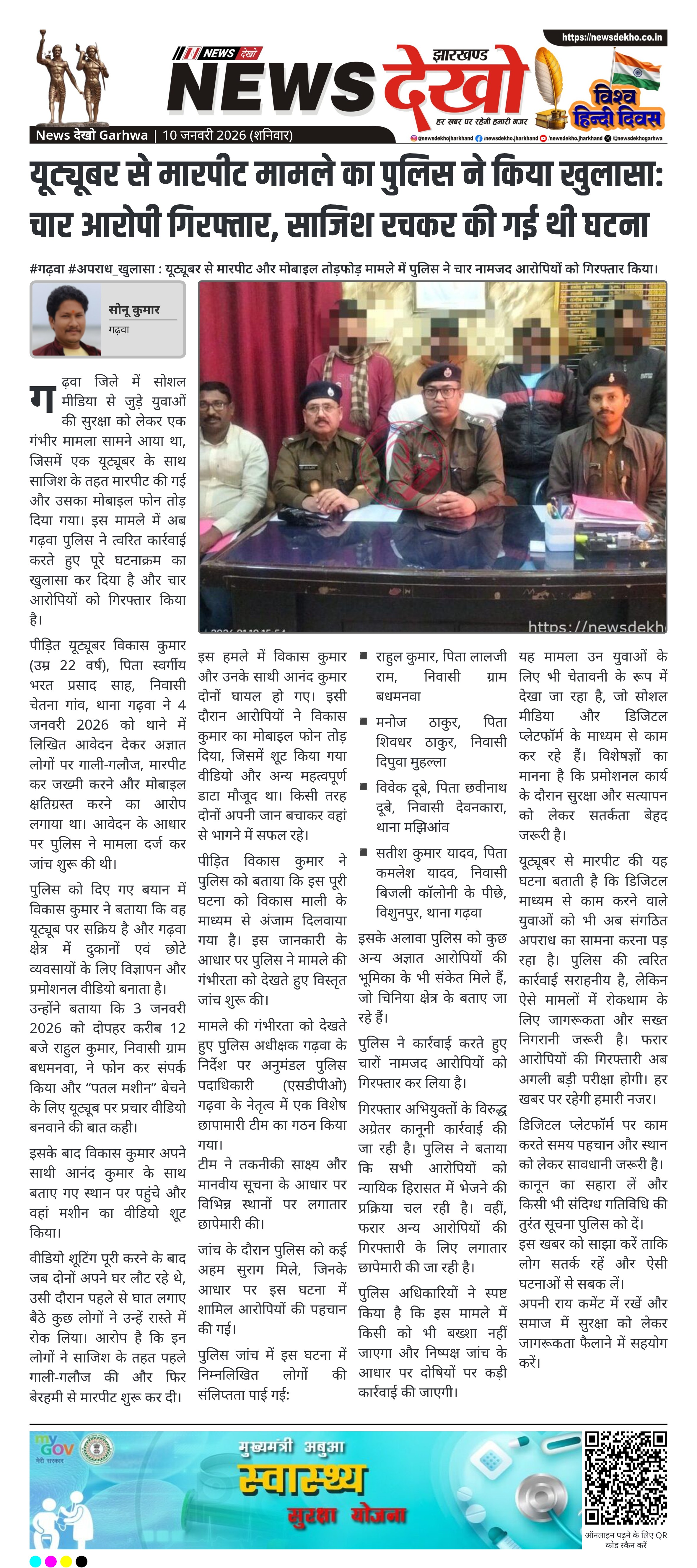 गढ़वा जिले में सोशल मीडिया से जुड़े युवाओं की सुरक्षा को लेकर एक गंभीर मामला सामने आया था, जिसमें एक यूट्यूबर के साथ साजिश के तहत मारपीट की गई और उसका मोबाइल फोन तोड़ दिया गया। इस मामले में अब गढ़वा पुलिस ने त्वरित कार्रवाई करते हुए पूरे घटनाक्रम का खुलासा कर दिया है और चार आरोपियों को गिरफ्तार किया है।