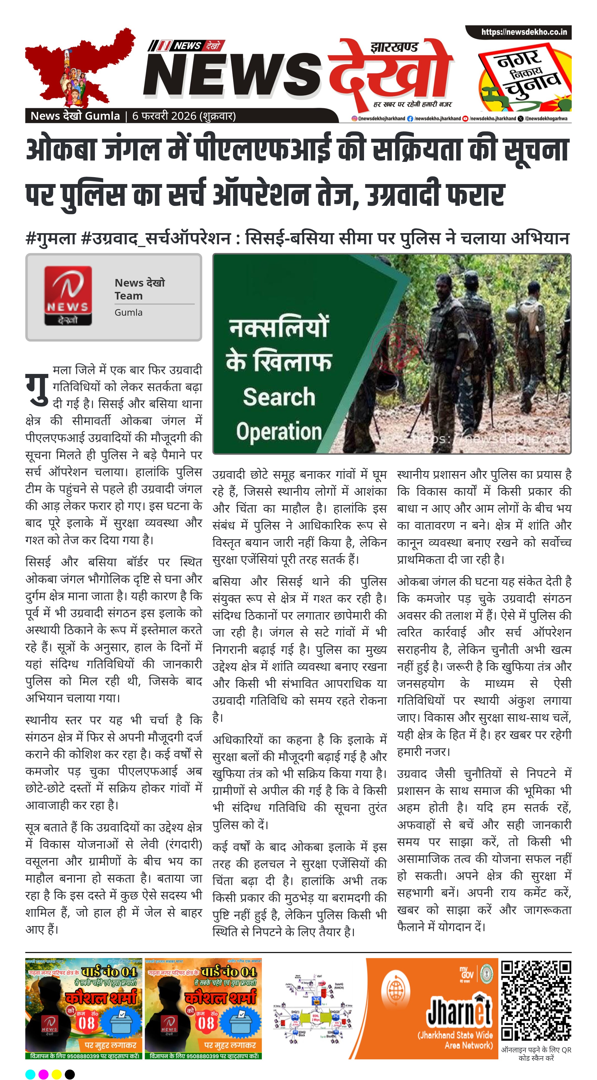 गुमला जिले के सिसई और बसिया थाना क्षेत्र की सीमा पर स्थित ओकबा जंगल में पीएलएफआई उग्रवादियों की मौजूदगी की सूचना पर पुलिस ने व्यापक सर्च ऑपरेशन शुरू किया। पुलिस के पहुंचने से पहले ही संदिग्ध उग्रवादी जंगल का लाभ उठाकर फरार हो गए। क्षेत्र में हाल के दिनों में संगठन की गतिविधियों की चर्चा से सुरक्षा एजेंसियां सतर्क हैं। गश्त और छापेमारी अभियान जारी है।