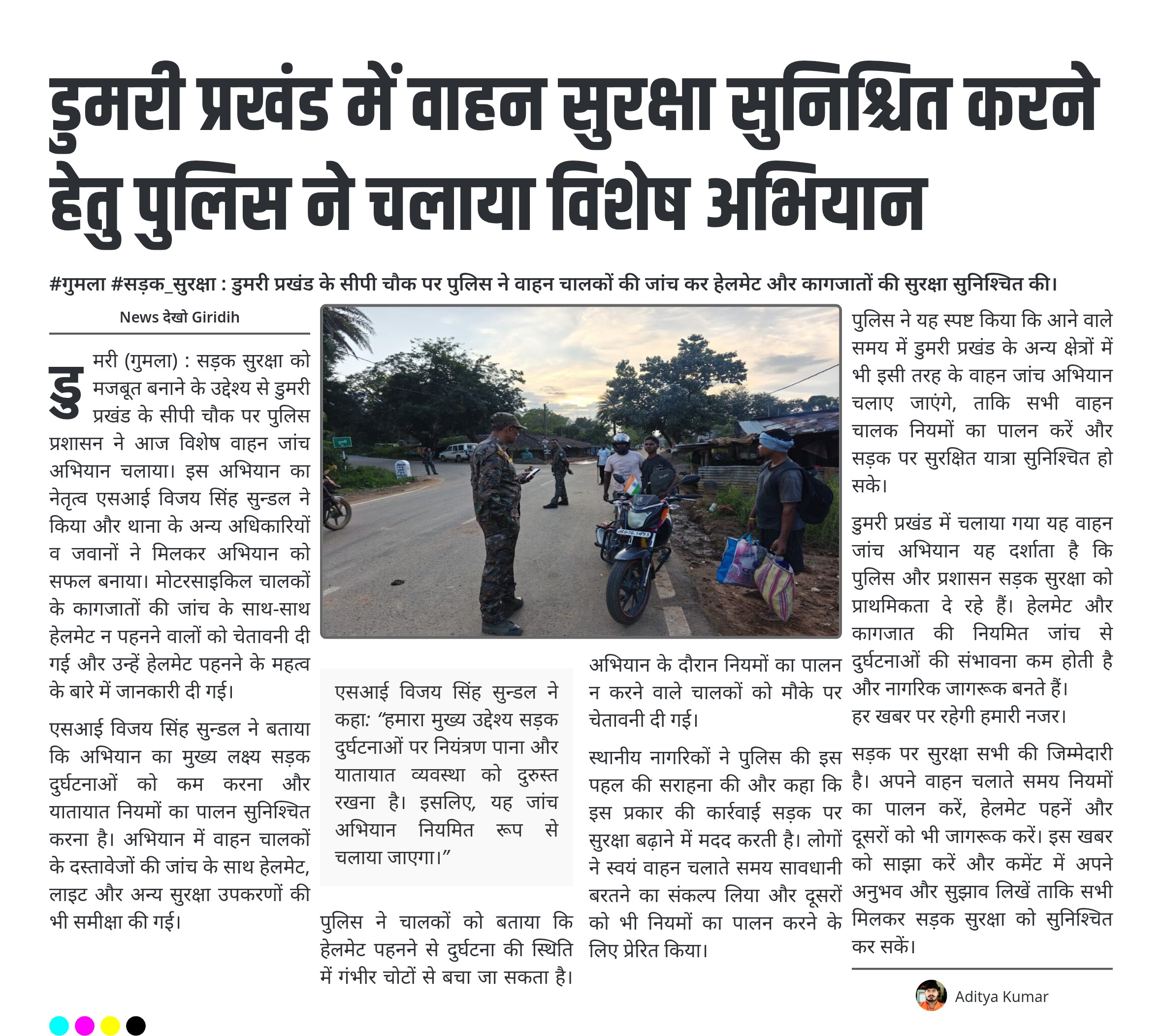 डुमरी (गुमला) : सड़क सुरक्षा को मजबूत बनाने के उद्देश्य से डुमरी प्रखंड के सीपी चौक पर पुलिस प्रशासन ने आज विशेष वाहन जांच अभियान चलाया। इस अभियान का नेतृत्व एसआई विजय सिंह सुन्डल ने किया और थाना के अन्य अधिकारियों व जवानों ने मिलकर अभियान को सफल बनाया। मोटरसाइकिल चालकों के कागजातों की जांच के साथ-साथ हेलमेट न पहनने वालों को चेतावनी दी गई और उन्हें हेलमेट पहनने के महत्व के बारे में जानकारी दी गई।