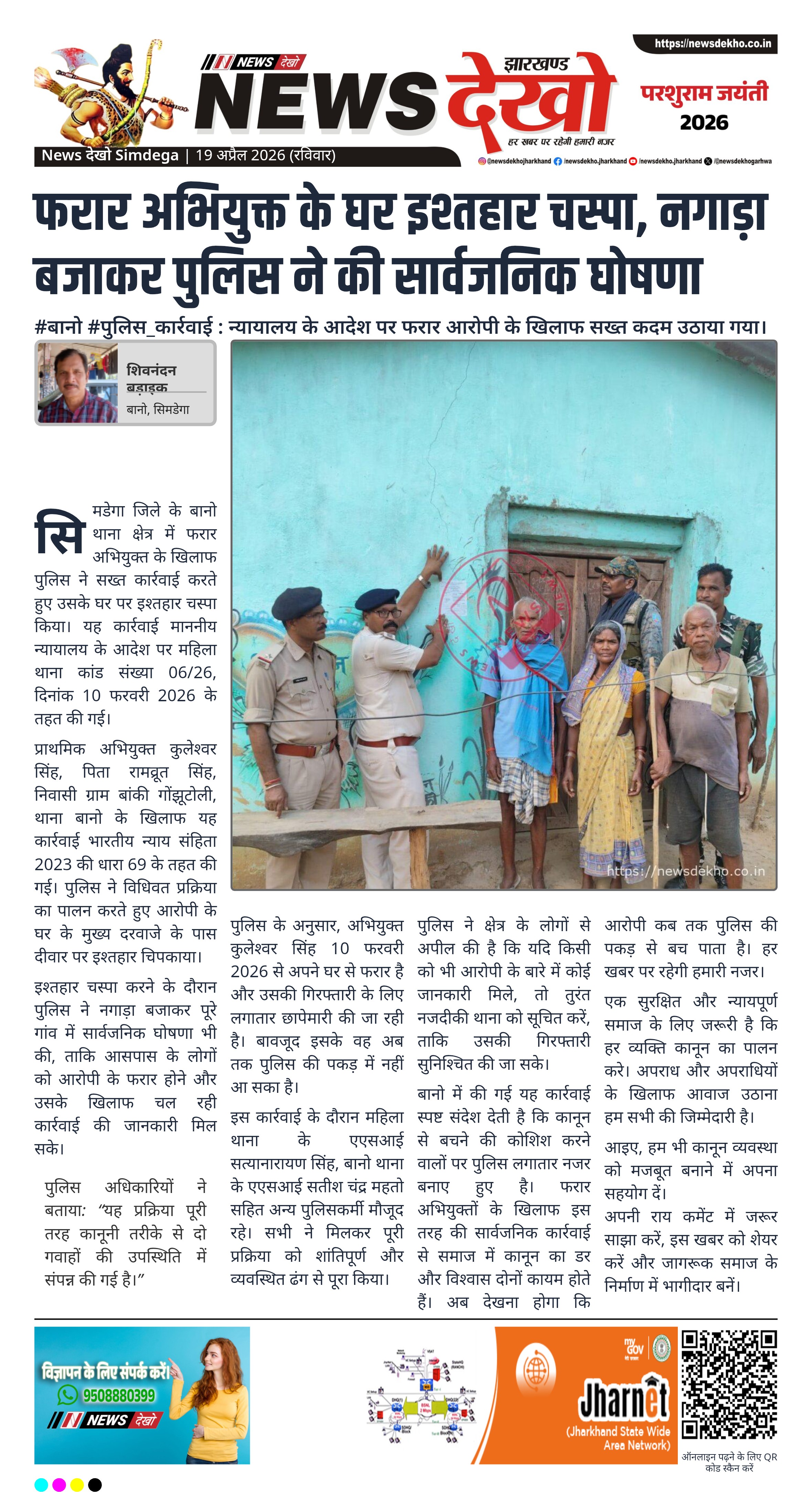 सिमडेगा जिले के बानो थाना क्षेत्र में फरार अभियुक्त के खिलाफ पुलिस ने सख्त कार्रवाई करते हुए उसके घर पर इश्तहार चस्पा किया। यह कार्रवाई माननीय न्यायालय के आदेश पर महिला थाना कांड संख्या 06/26, दिनांक 10 फरवरी 2026 के तहत की गई।