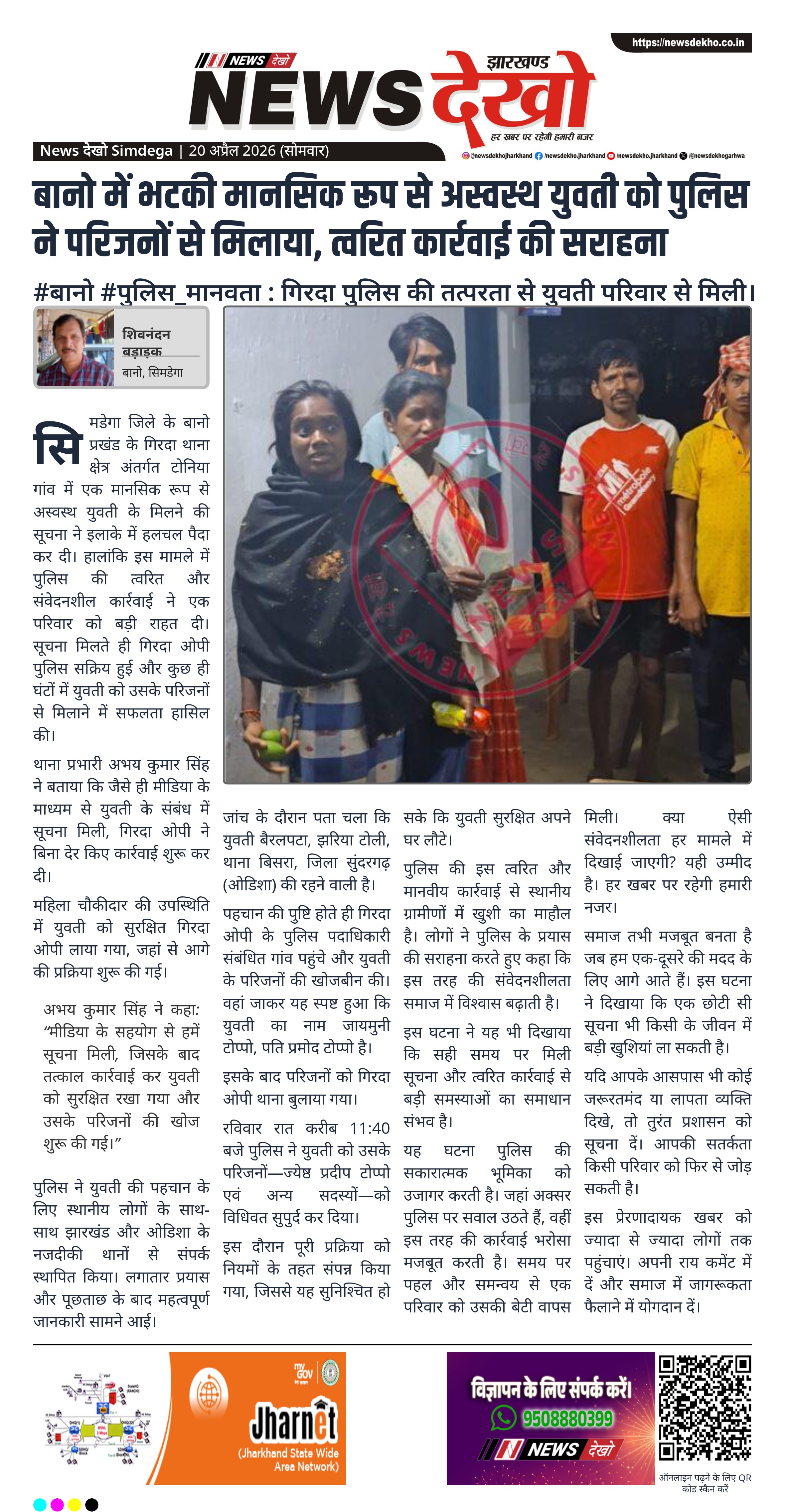 सिमडेगा जिले के बानो प्रखंड अंतर्गत टोनिया गांव में मिली एक मानसिक रूप से अस्वस्थ युवती को पुलिस ने त्वरित कार्रवाई करते हुए उसके परिजनों से मिलाया। मीडिया के माध्यम से सूचना मिलने के बाद गिरदा ओपी ने तुरंत खोजबीन शुरू की। काफी प्रयास के बाद युवती की पहचान ओडिशा के सुंदरगढ़ जिले की निवासी के रूप में हुई। रविवार देर रात उसे सुरक्षित परिजनों को सौंप दिया गया।
