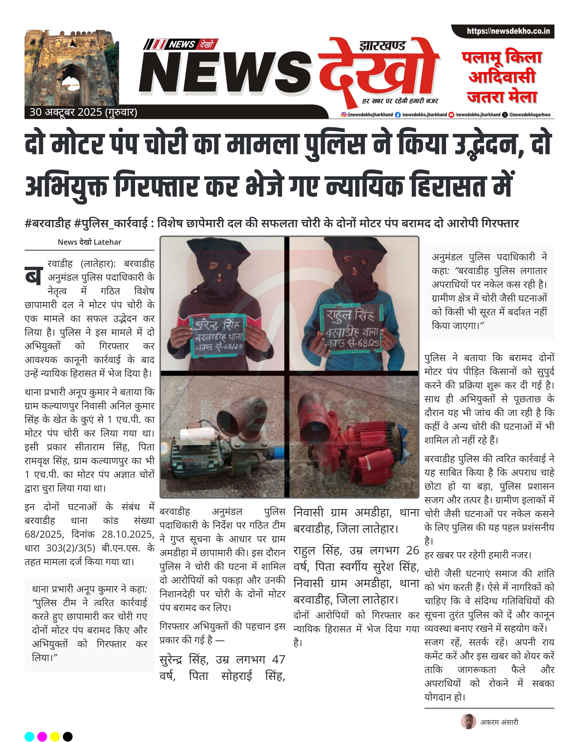 बरवाडीह अनुमंडल पुलिस पदाधिकारी के निर्देश पर गठित टीम ने गुप्त सूचना के आधार पर ग्राम अमडीहा में छापामारी की। इस दौरान पुलिस ने चोरी की घटना में शामिल दो आरोपियों को पकड़ा और उनकी निशानदेही पर चोरी के दोनों मोटर पंप बरामद कर लिए।