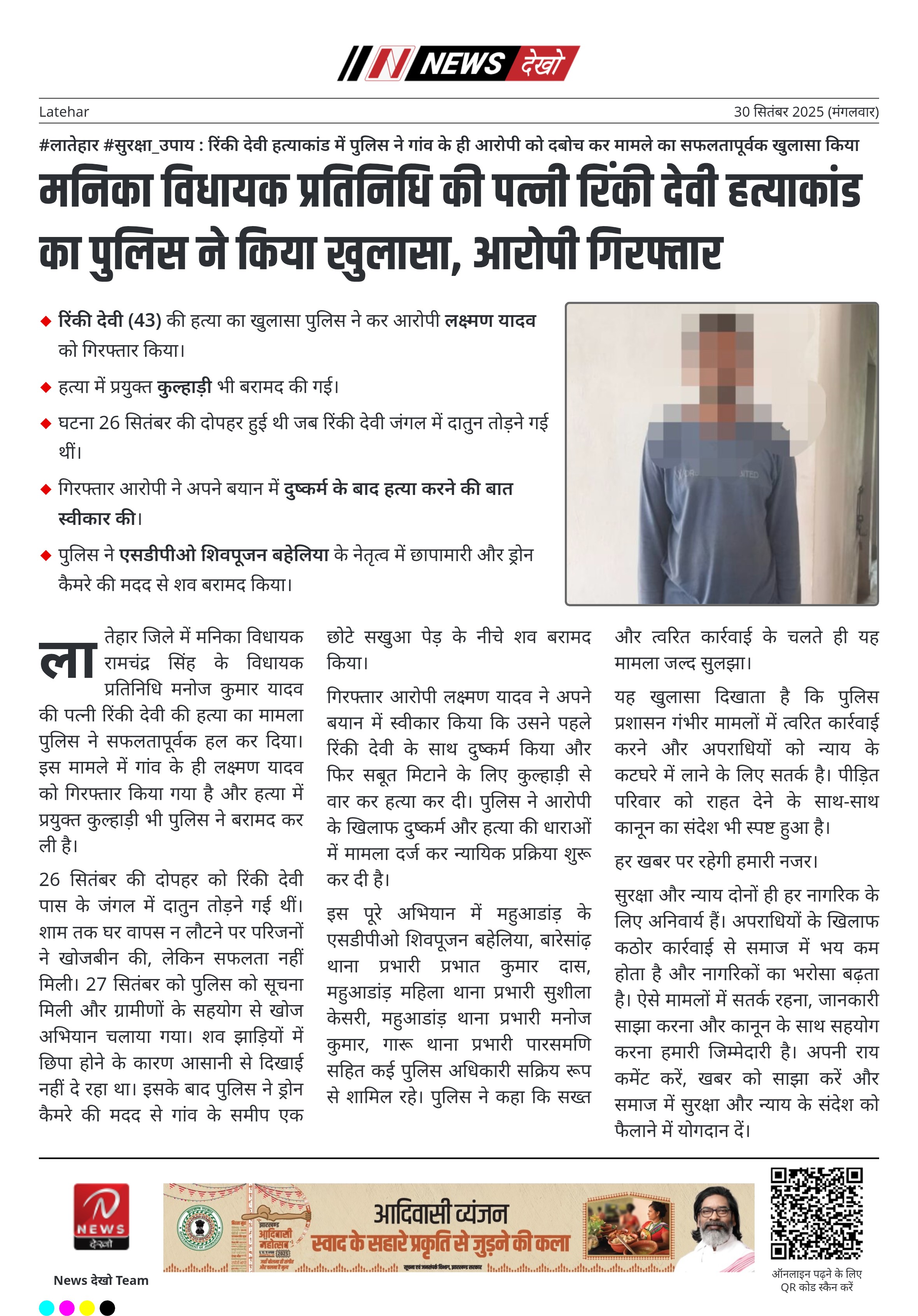 #लातेहार #सुरक्षा_उपाय : रिंकी देवी हत्याकांड में पुलिस ने गांव के ही आरोपी को दबोच कर मामले का सफलतापूर्वक खुलासा किया