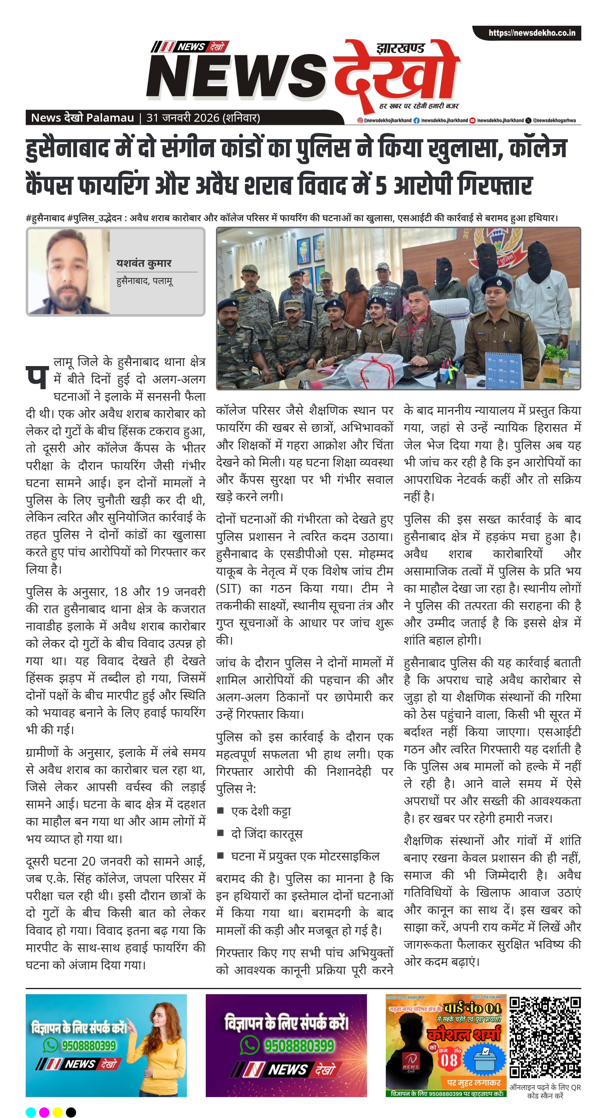 पलामू जिले के हुसैनाबाद थाना क्षेत्र में हाल के दिनों में हुई दो गंभीर आपराधिक घटनाओं का पुलिस ने सफल उद्भेदन कर लिया है। अवैध शराब विवाद में हुई फायरिंग और कॉलेज कैंपस में परीक्षा के दौरान गोली चलने की घटना से क्षेत्र में दहशत फैली थी। पुलिस ने विशेष जांच टीम के माध्यम से दोनों मामलों में शामिल पांच आरोपियों को गिरफ्तार किया है। इस कार्रवाई से क्षेत्र की कानून-व्यवस्था को लेकर अहम संदेश गया है।