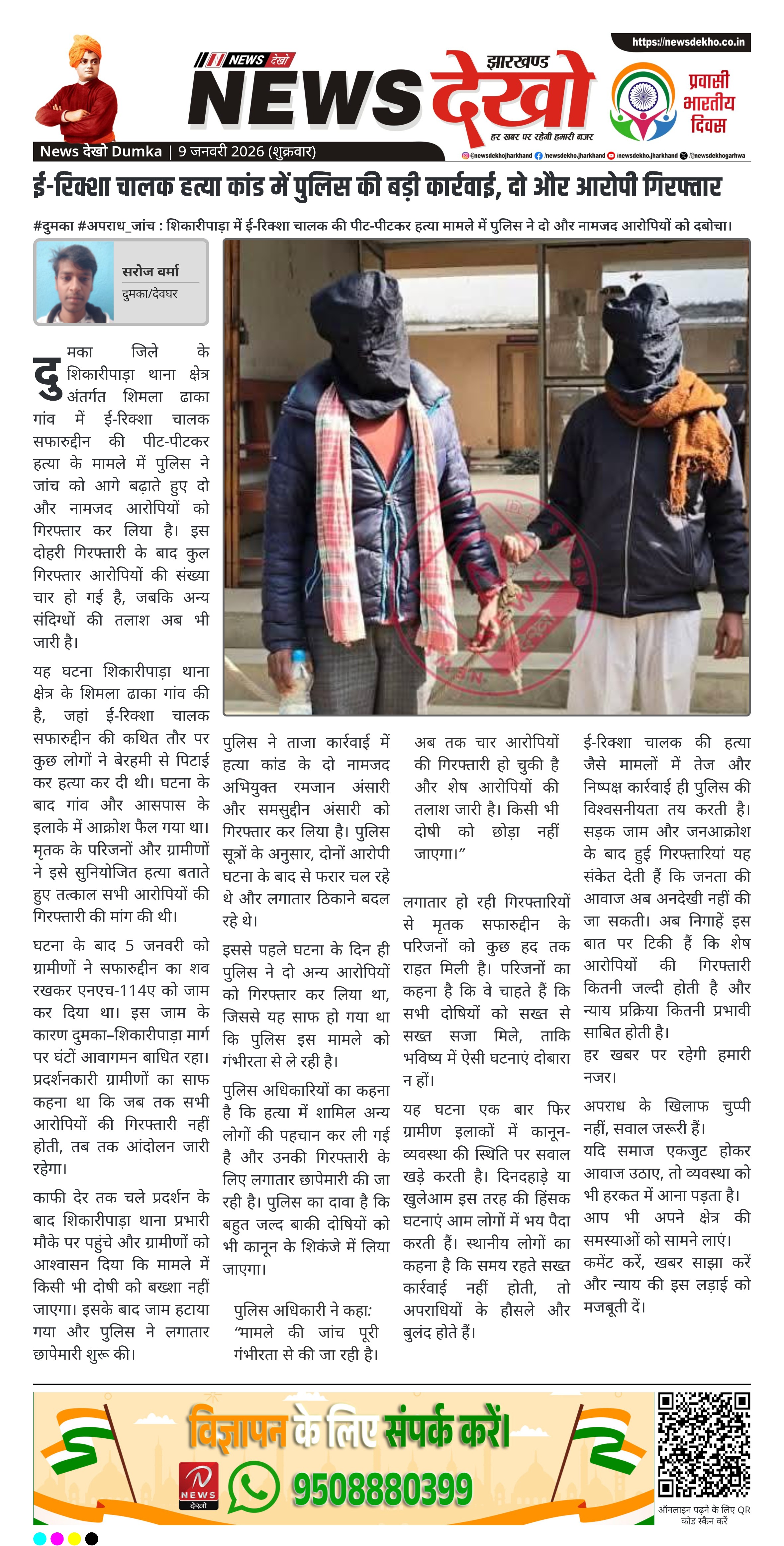 #दुमका #अपराध_जांच : शिकारीपाड़ा में ई-रिक्शा चालक की पीट-पीटकर हत्या मामले में पुलिस ने दो और नामजद आरोपियों को दबोचा।
