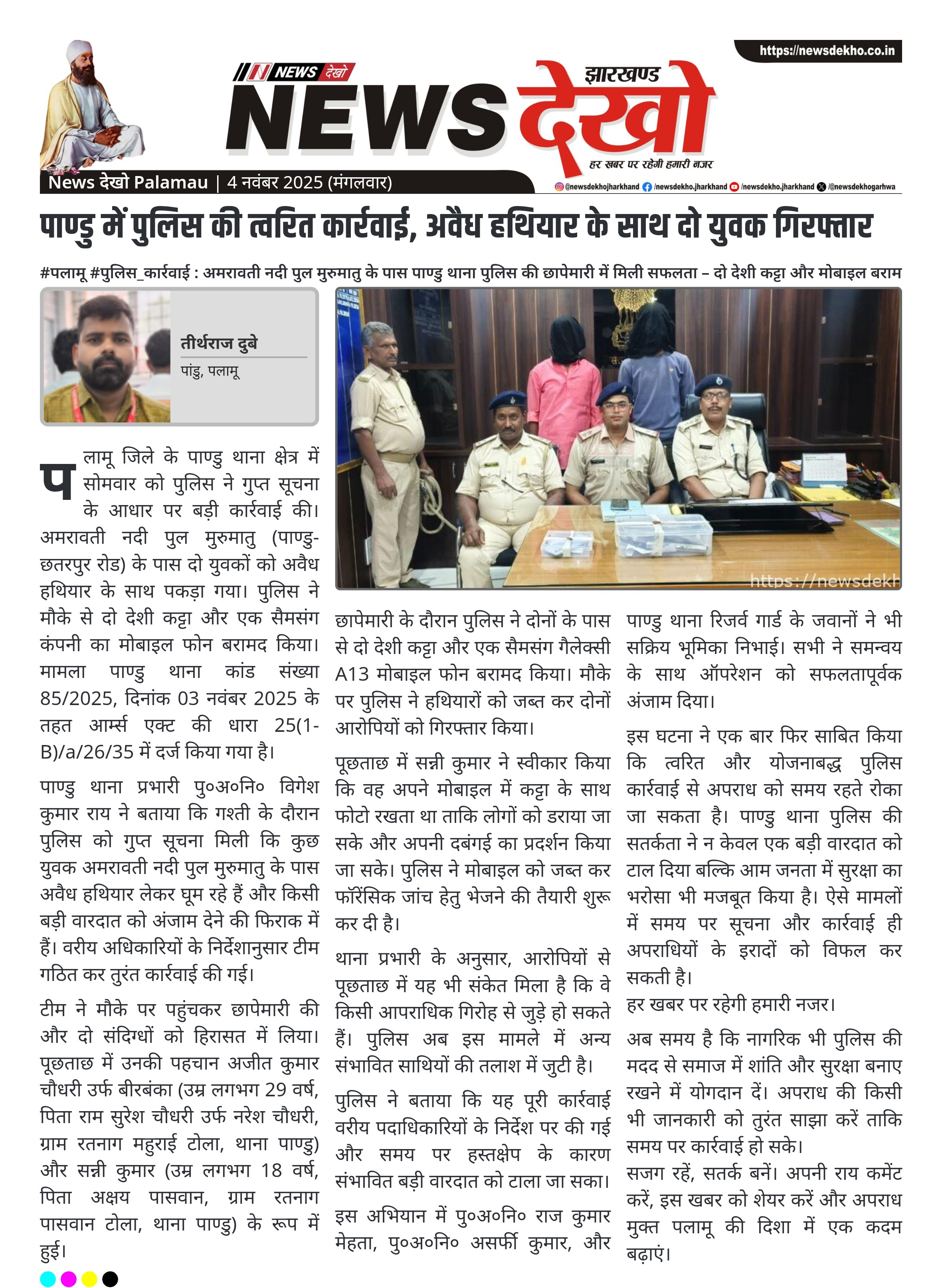 पलामू जिले के पाण्डु थाना क्षेत्र में सोमवार को पुलिस ने गुप्त सूचना के आधार पर बड़ी कार्रवाई की। अमरावती नदी पुल मुरुमातु (पाण्डु-छतरपुर रोड) के पास दो युवकों को अवैध हथियार के साथ पकड़ा गया। पुलिस ने मौके से दो देशी कट्टा और एक सैमसंग कंपनी का मोबाइल फोन बरामद किया। मामला पाण्डु थाना कांड संख्या 85/2025, दिनांक 03 नवंबर 2025 के तहत आर्म्स एक्ट की धारा 25(1-B)/a/26/35 में दर्ज किया गया है।
