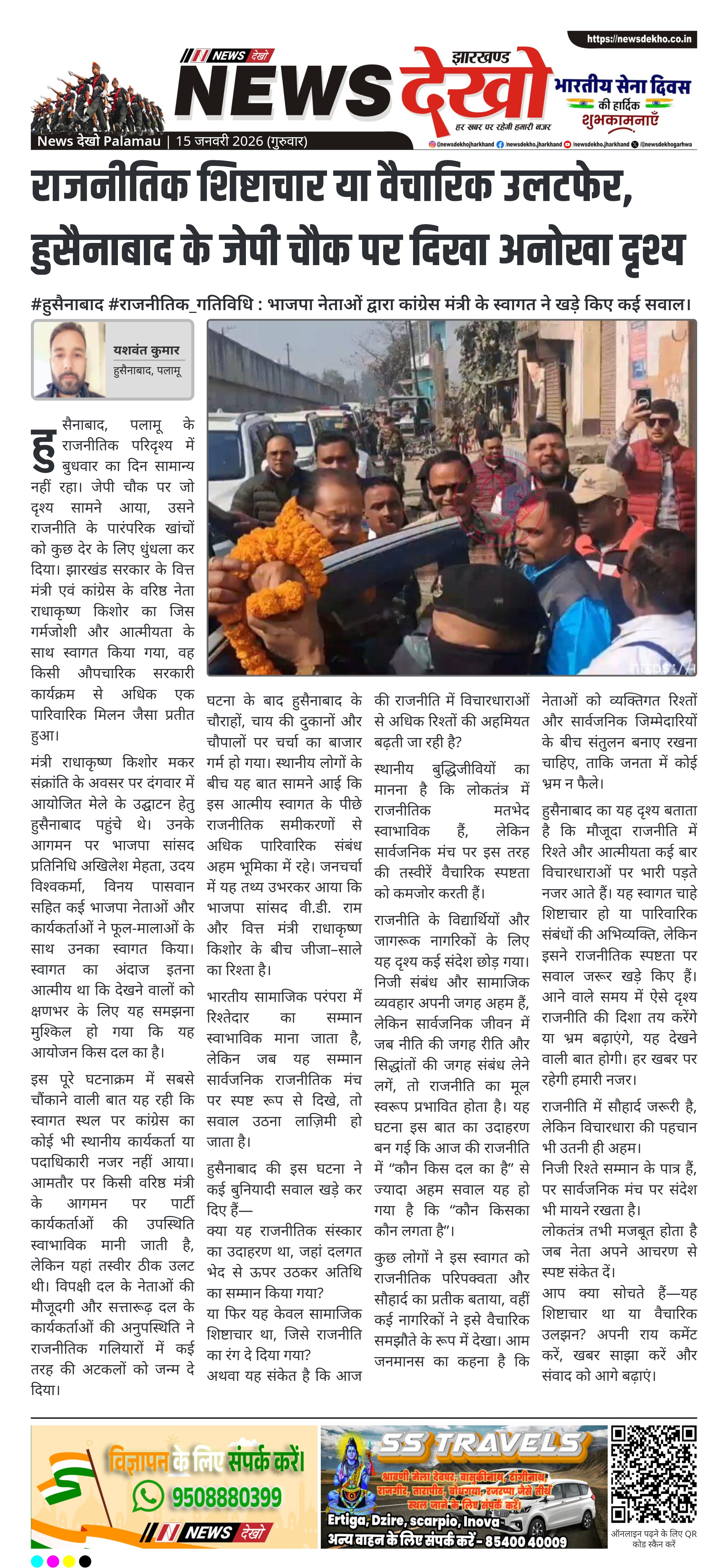 हुसैनाबाद के जेपी चौक पर बुधवार को एक ऐसा राजनीतिक दृश्य देखने को मिला, जिसने स्थानीय राजनीति में नई बहस छेड़ दी। झारखंड सरकार के वित्त मंत्री और कांग्रेस के वरिष्ठ नेता राधाकृष्ण किशोर का स्वागत भाजपा सांसद प्रतिनिधियों और कार्यकर्ताओं ने किया। मकर संक्रांति के अवसर पर दंगवार मेला उद्घाटन के लिए पहुंचे मंत्री का कांग्रेस कार्यकर्ताओं की अनुपस्थिति में भाजपा नेताओं द्वारा अभिनंदन चर्चा का केंद्र बन गया। इस घटनाक्रम ने राजनीतिक शिष्टाचार, रिश्तों और विचारधाराओं की सीमाओं पर सवाल खड़े कर दिए।