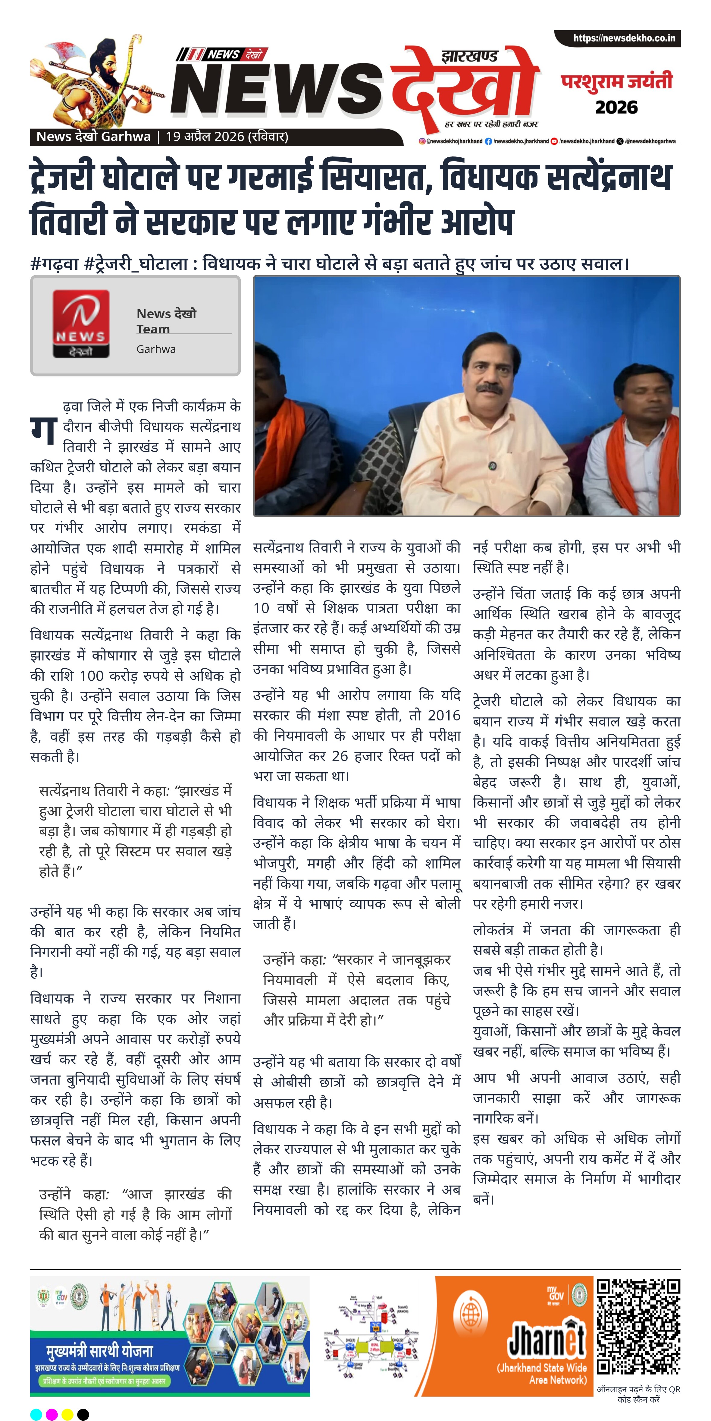 सत्येंद्रनाथ तिवारी ने कहा: “झारखंड में हुआ ट्रेजरी घोटाला चारा घोटाले से भी बड़ा है। जब कोषागार में ही गड़बड़ी हो रही है, तो पूरे सिस्टम पर सवाल खड़े होते हैं।”