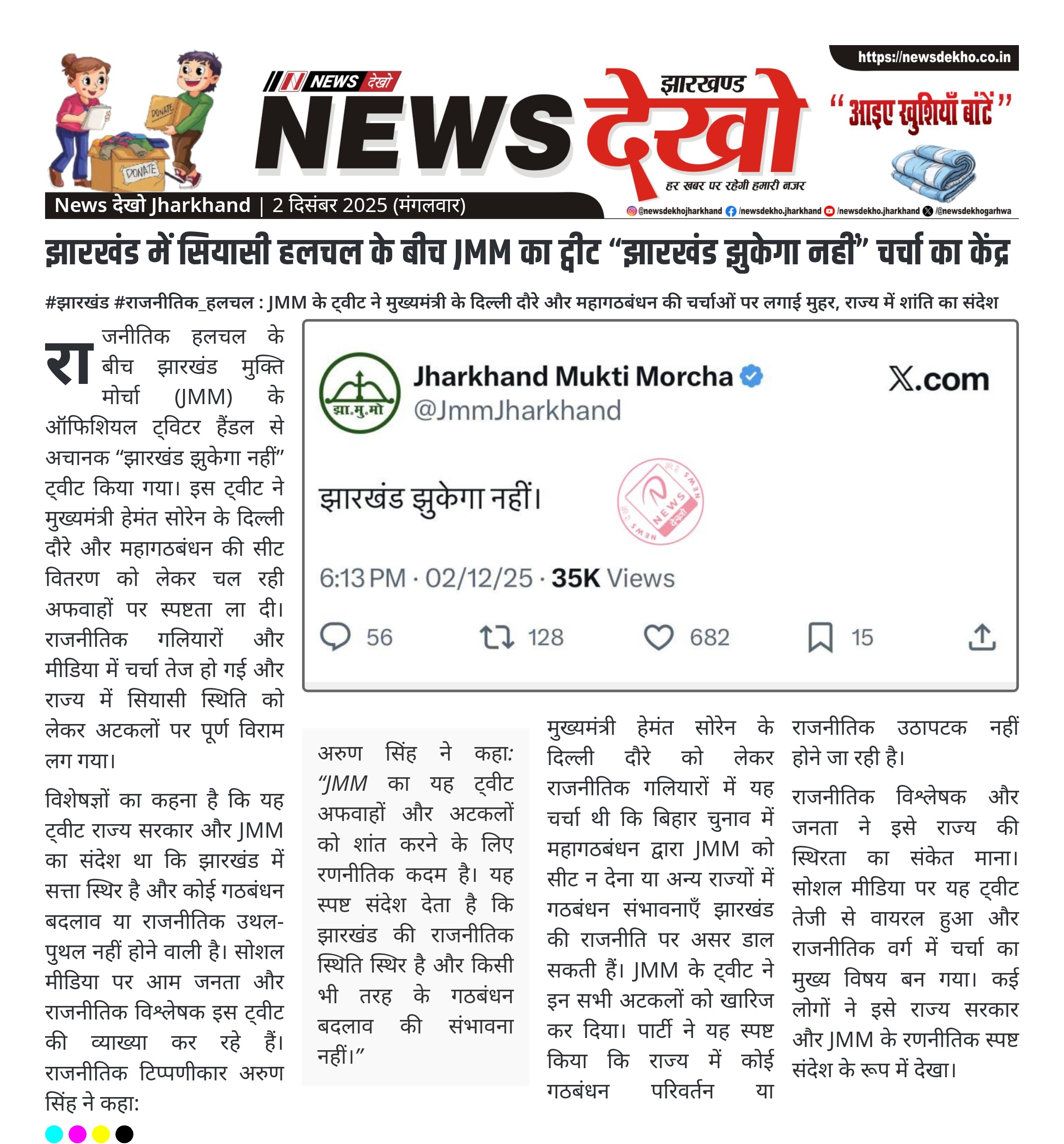 झारखंड में सियासी हलचल के बीच JMM का ट्वीट “झारखंड झुकेगा नहीं” चर्चा का केंद्र