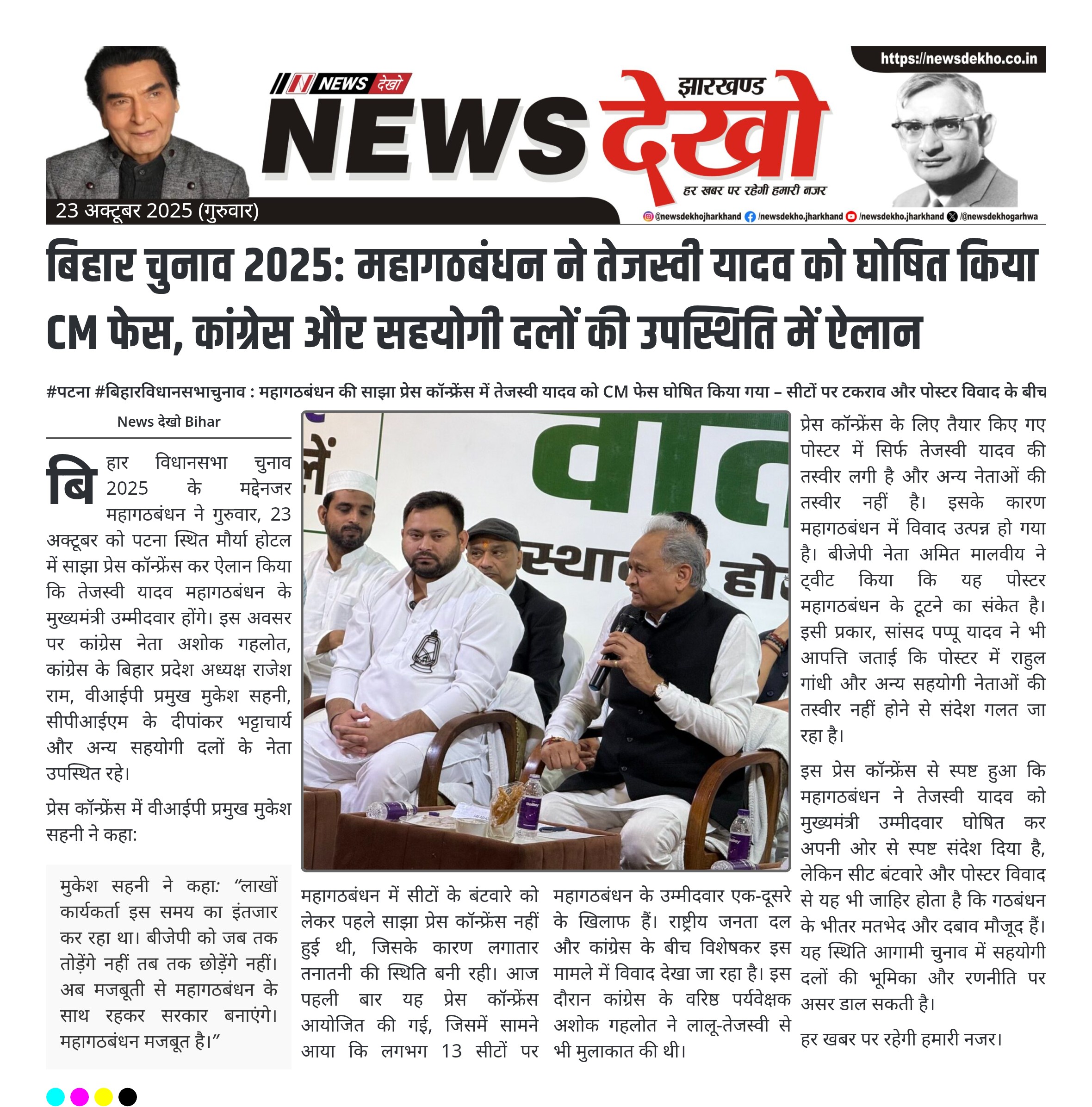 #पटना #बिहारविधानसभाचुनाव : महागठबंधन की साझा प्रेस कॉन्फ्रेंस में तेजस्वी यादव को CM फेस घोषित किया गया – सीटों पर टकराव और पोस्टर विवाद के बीच ऐलान तेजस्वी यादव महागठबंधन के मुख्यमंत्री उम्मीदवार घोषित। साझा प्रेस कॉन्फ्रेंस पटना के मौर्या होटल में आयोजित। अशोक गहलोत, राजेश राम, मुकेश सहनी और…