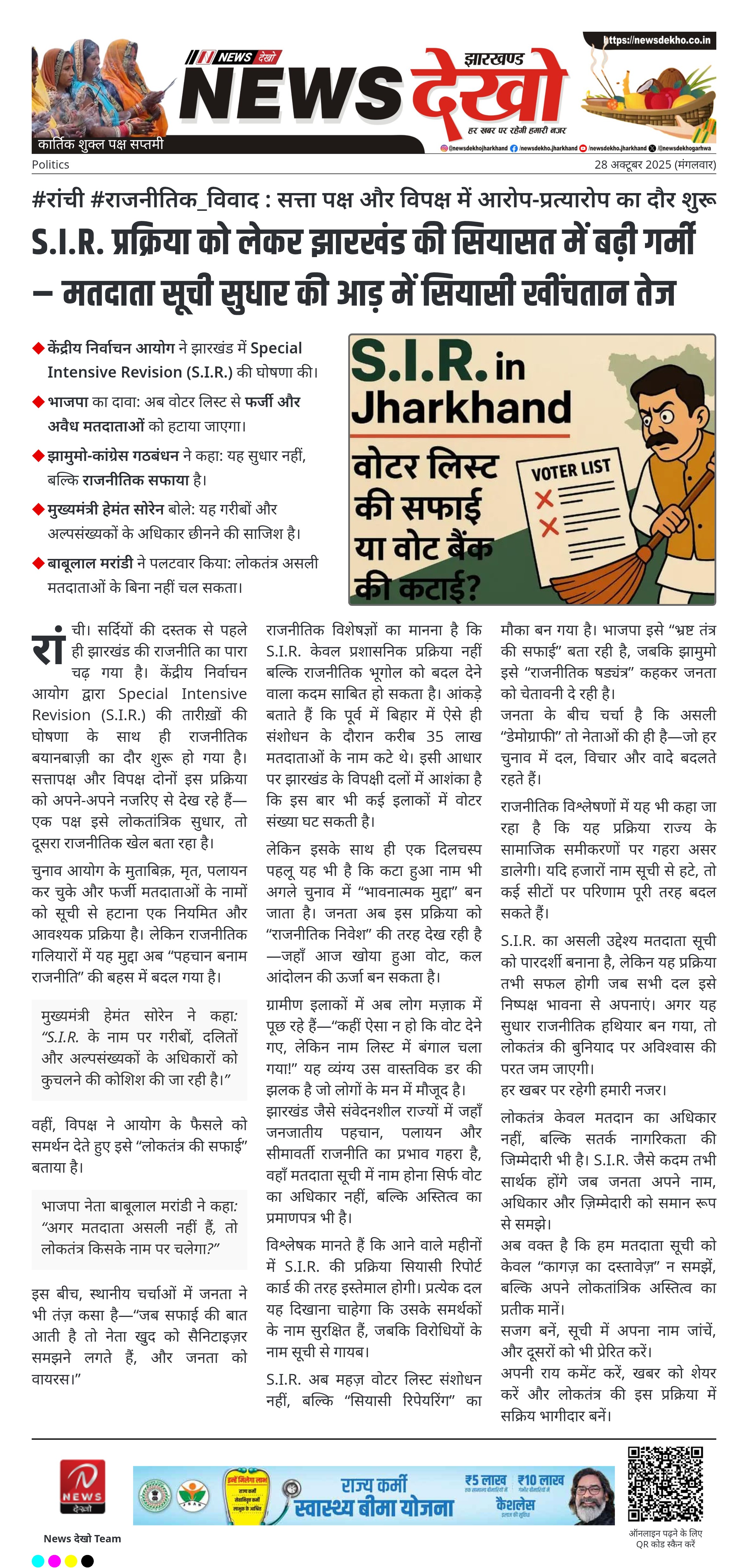 #रांची #राजनीतिक_विवाद : सत्ता पक्ष और विपक्ष में आरोप-प्रत्यारोप का दौर शुरू केंद्रीय निर्वाचन आयोग ने झारखंड में Special Intensive Revision (S.I.R.) की घोषणा की। भाजपा का दावा: अब वोटर लिस्ट से फर्जी और अवैध मतदाताओं को हटाया जाएगा। झामुमो-कांग्रेस गठबंधन ने कहा: यह सुधार नहीं, बल्कि राजनीतिक सफाया है।…