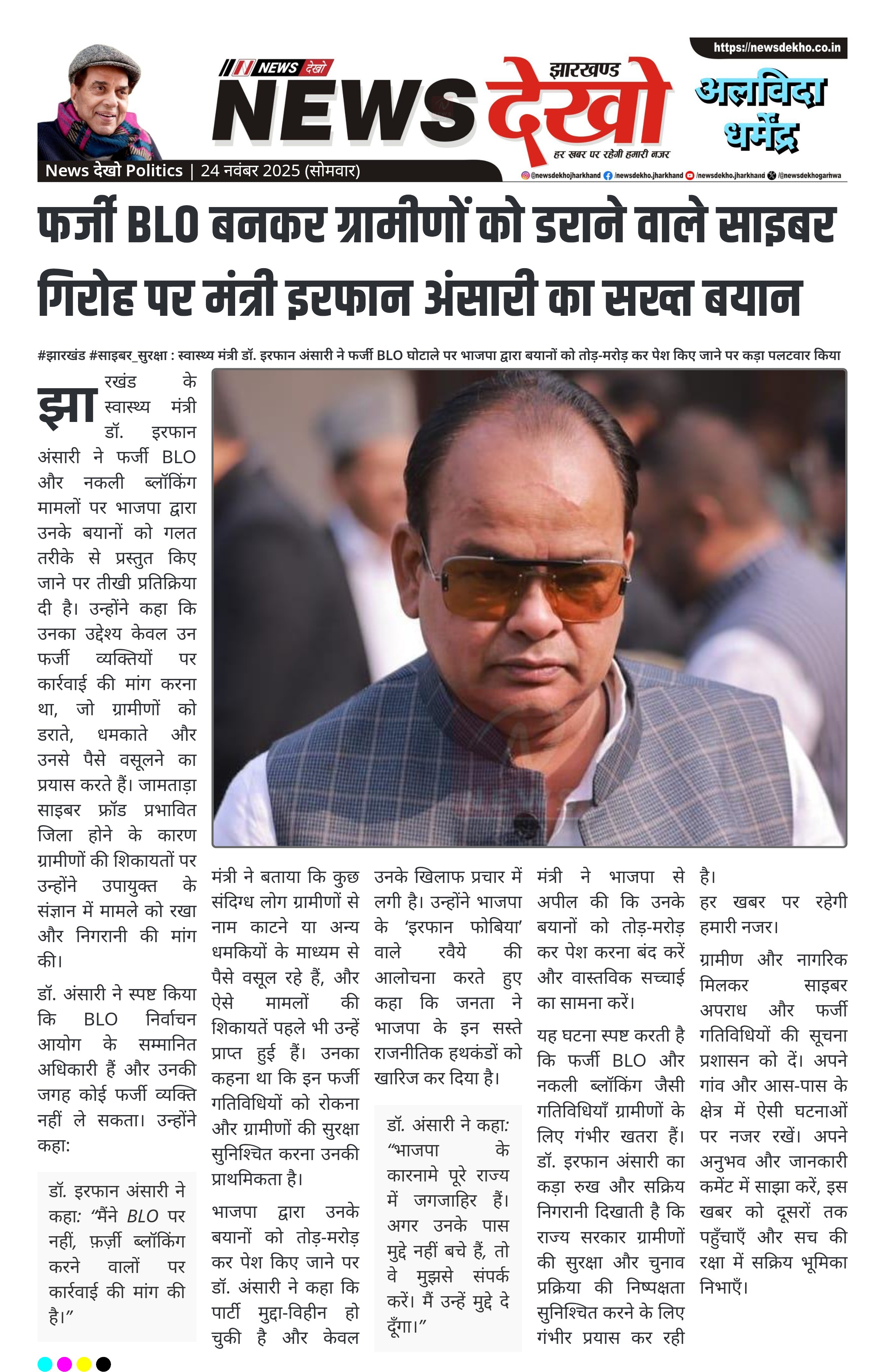 #झारखंड #साइबर_सुरक्षा : स्वास्थ्य मंत्री डॉ. इरफान अंसारी ने फर्जी BLO घोटाले पर भाजपा द्वारा बयानों को तोड़-मरोड़ कर पेश किए जाने पर कड़ा पलटवार किया स्वास्थ्य मंत्री डॉ. इरफान अंसारी ने फर्जी BLO मामलों पर चर्चा की। जामताड़ा जिले में नकली BLO बनकर ग्रामीणों को डराने और पैसे वसूलने…
