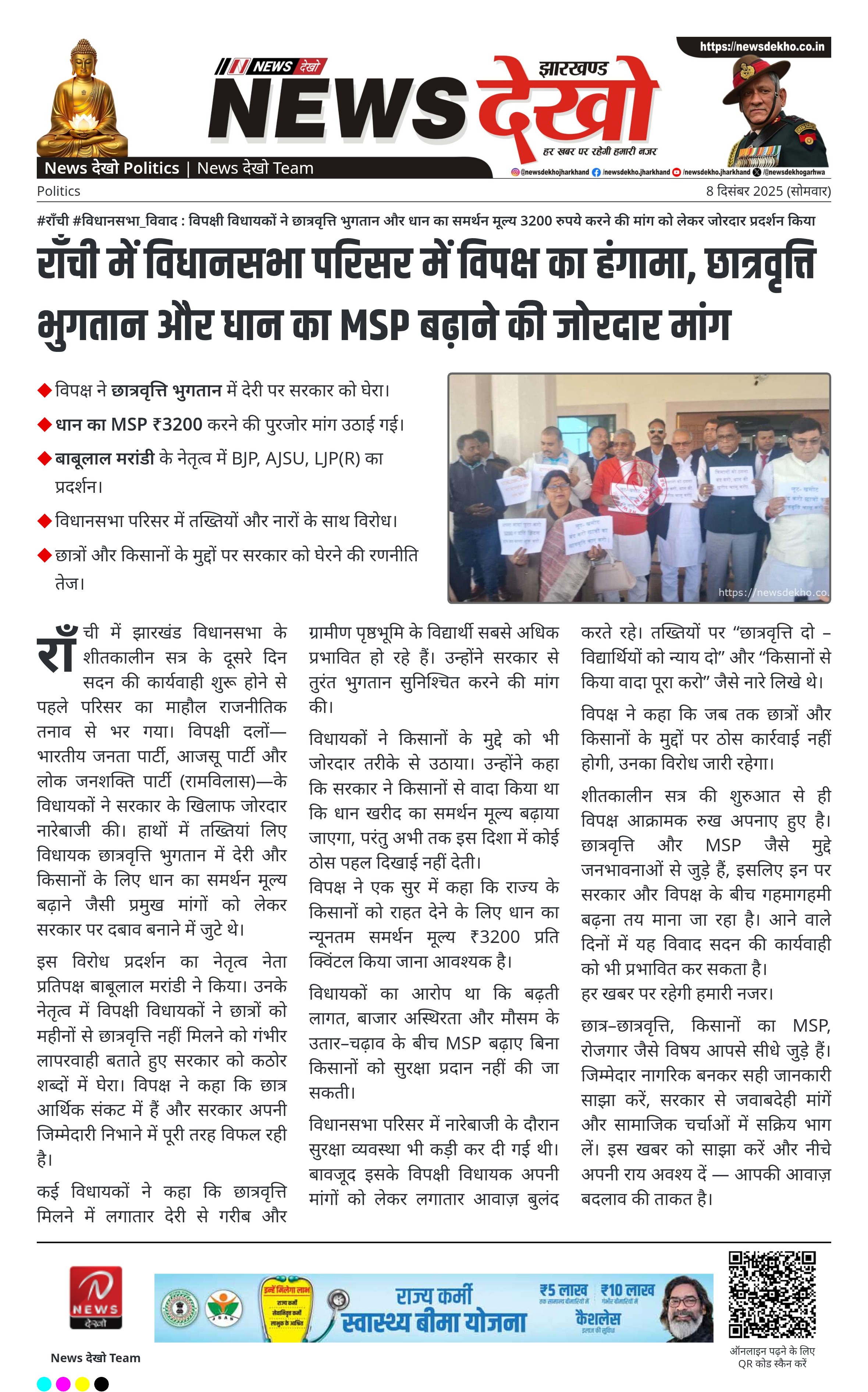 #राँची #विधानसभा_विवाद : विपक्षी विधायकों ने छात्रवृत्ति भुगतान और धान का समर्थन मूल्य 3200 रुपये करने की मांग को लेकर जोरदार प्रदर्शन किया विपक्ष ने छात्रवृत्ति भुगतान में देरी पर सरकार को घेरा। धान का MSP ₹3200 करने की पुरजोर मांग उठाई गई। बाबूलाल मरांडी के नेतृत्व में BJP, AJSU,…